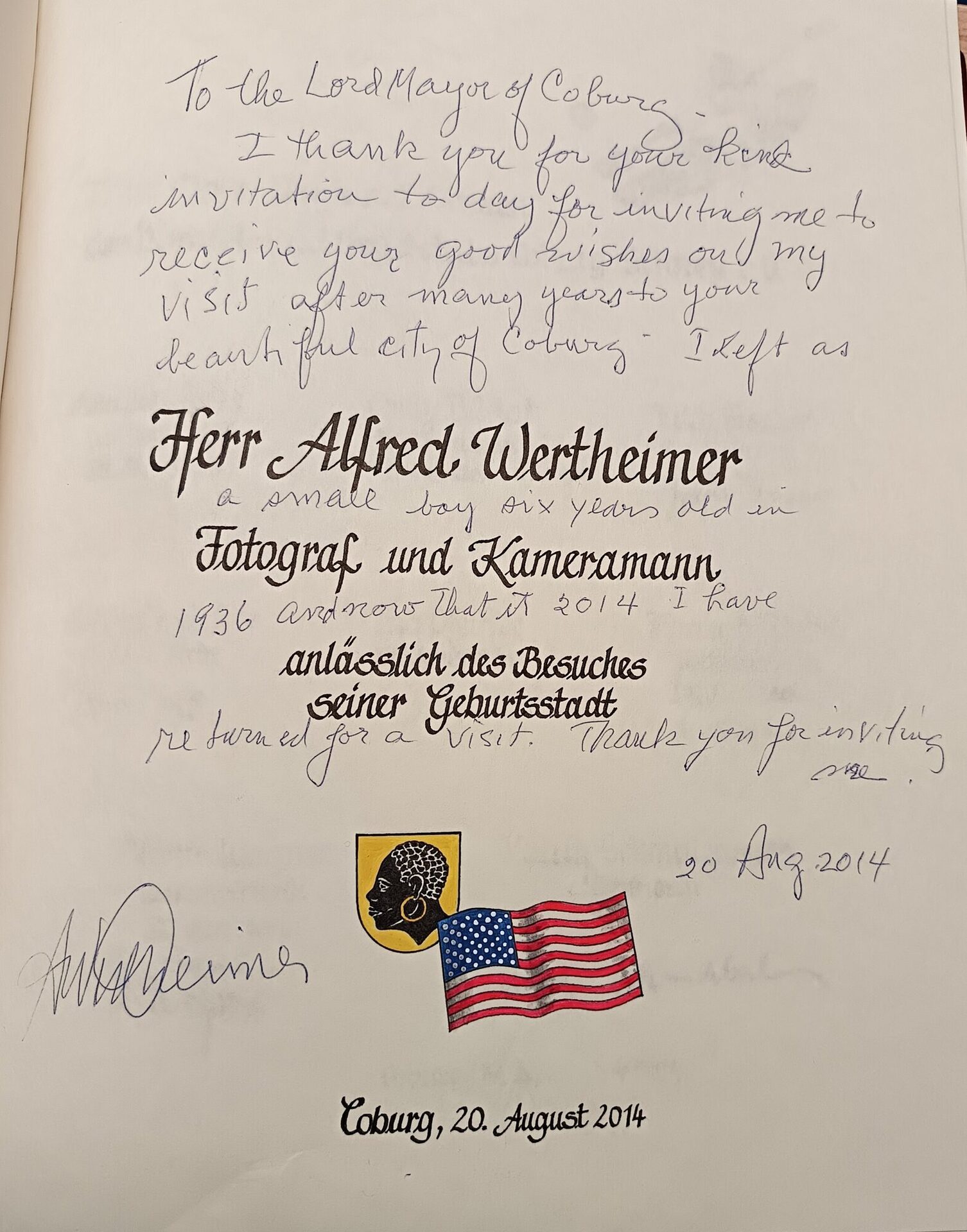 Eintrag Alfred Wertheimers in das Goldene Buch der Stadt Coburg
