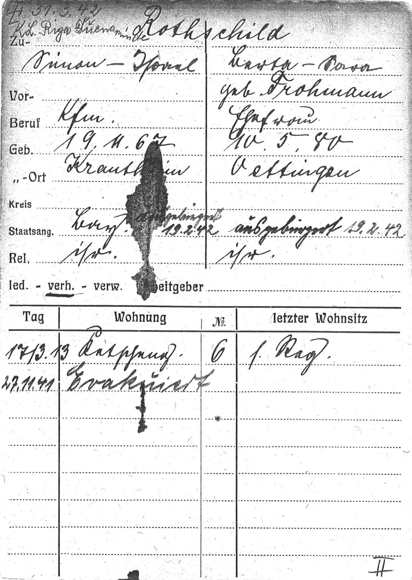 Das Ehepaar Rothschild wurde zunächst nach Nürnberg gebracht und von dort mit einem Sammeltransport nach Riga deportiert. Ziel war das Lager Jungfernhof, ein von der SS auf einem ehemaligen landwirtschaftlichen Gut provisorisch eingerichtetes Lager für Juden aus dem Deutschen Reich. Für die Deportation mussten die Betroffenen eine Gebühr von 60 Reichsmark entrichten. Der Transport, der etwa 1.000 Personen umfasste, erfolgte in überfüllten, unbeheizten Güterwaggons, ohne ausreichende Versorgung. Zeugenaussagen belegen, dass die Deportierten während der mehrtägigen Fahrt kaum Wasser erhielten. Viele erkrankten bereits unterwegs.[26]