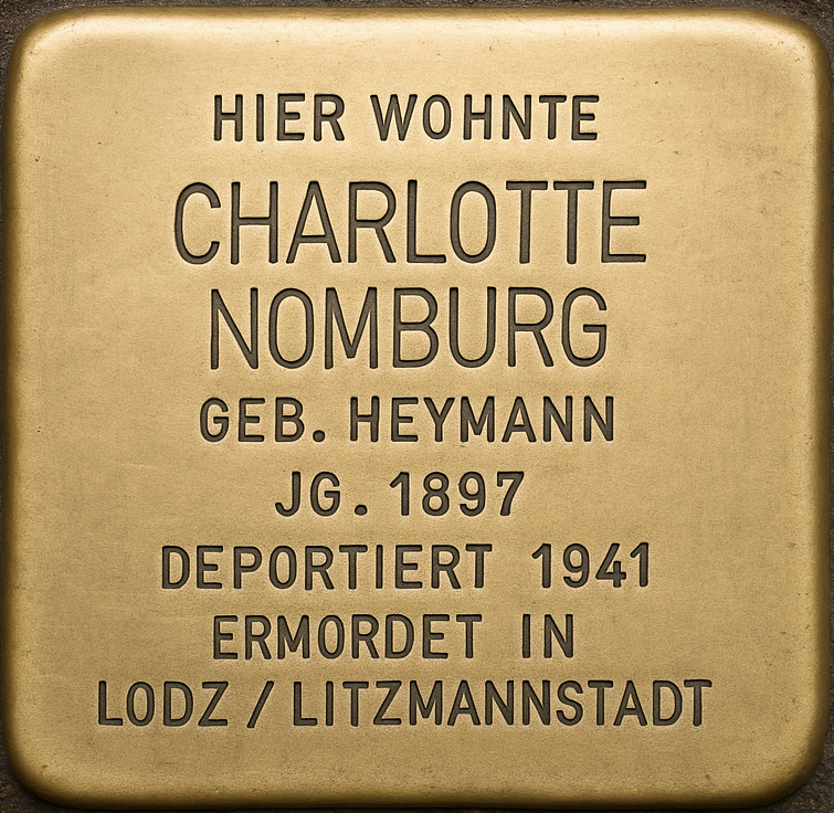 Charlotte Nomburg und ihr Ehemann überlebten die lebensfeindlichen Bedingungen im Ghetto zunächst. Sie selbst arbeitete dort als Stenotypistin.[29] Am 10. Mai 1942 wurden sie jedoch in das nahegelegene Vernichtungslager Kulmhof (Chelmno) deportiert. Dort wurden sie noch am gleichen Tag in einem Gaswagen ermordet.[30] Kulmhof war das erste Vernichtungslager, das stationäre Gaskammern zur massenhaften Ermordung von Menschen einsetzte. Bis zur Auflösung des Lagers im Jahr 1944 wurden dort mindestens 152.000 Menschen ermordet, darunter zahlreiche aus dem Ghetto Litzmannstadt deportierte Juden.