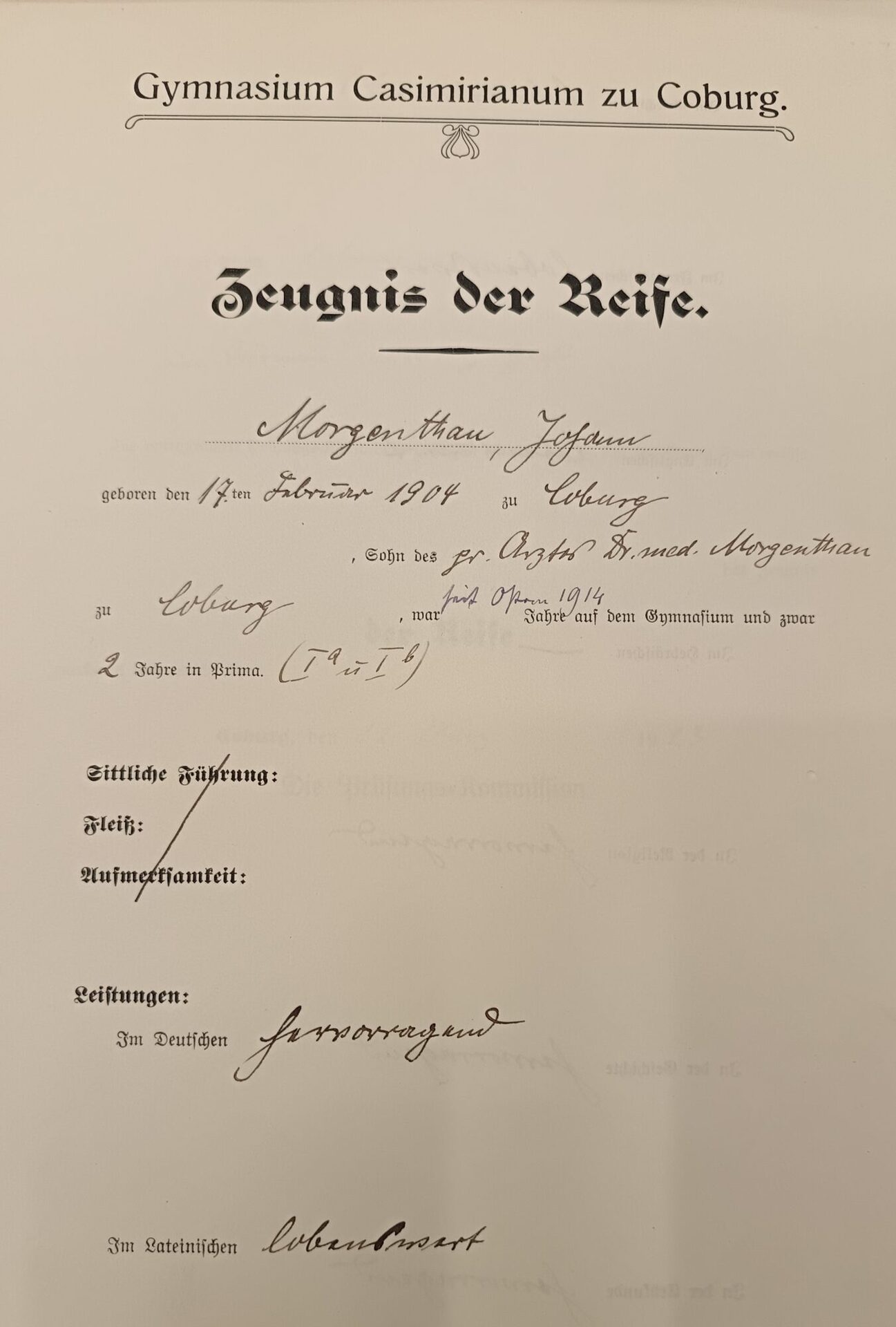 [1]   Stadtarchiv Coburg, Einwohnermelde Karte, Morgenthau, Hans; Siehe auch: „Regierungs-Blatt für das Herzogthum Coburg“ vom 27. Februar 1904.