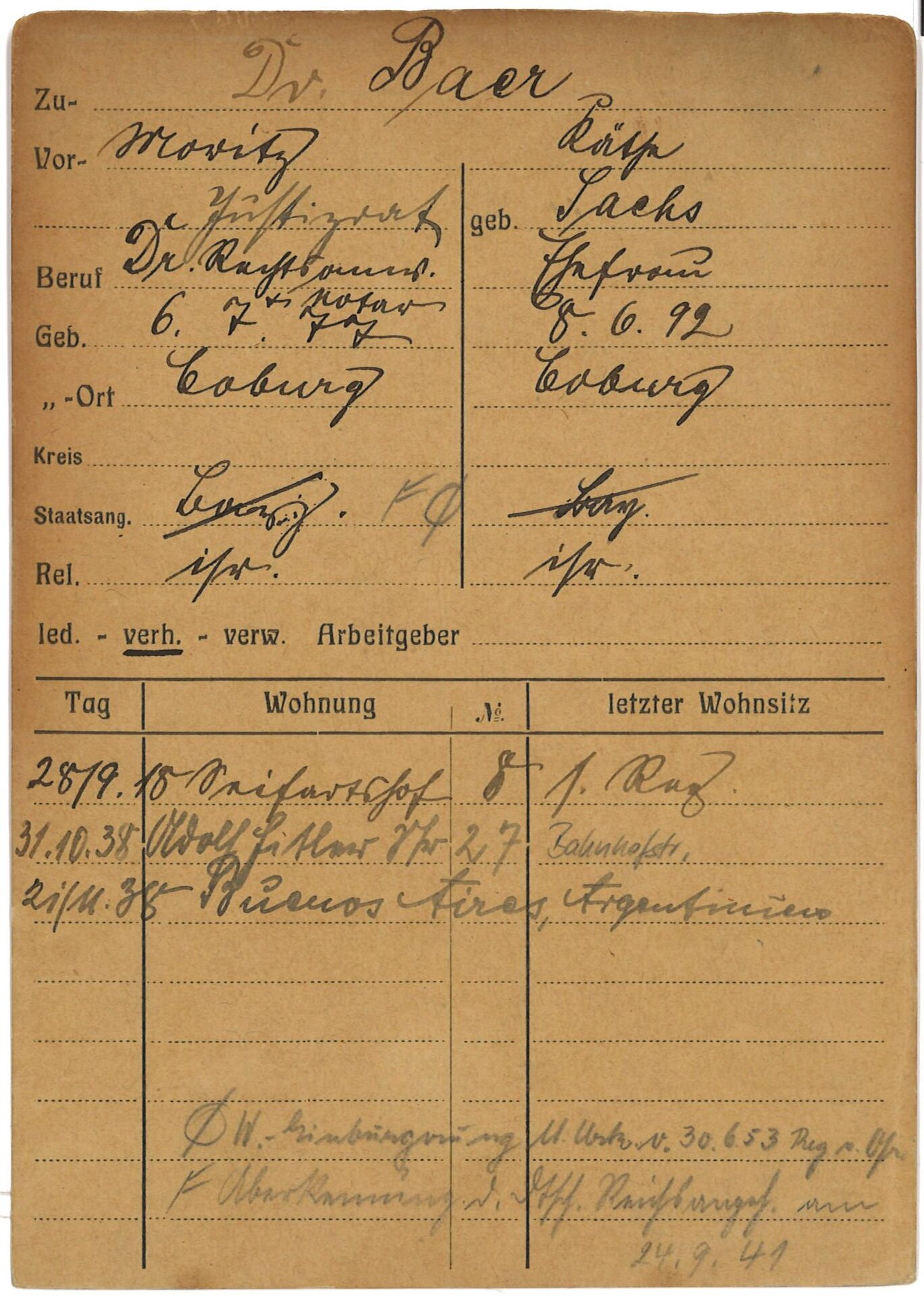 [42] Stadtarchiv Coburg, Einwohnerkartei, Baer, Moritz und Käthe.