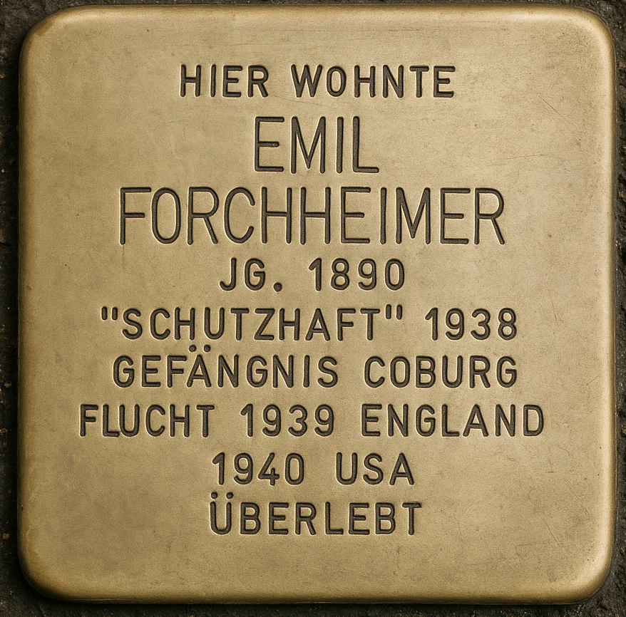 [25] Stolperstein für Emil, Forchheimer, Bahnhofstraße 28, in: Digitales Stadtgedächtnis (https://www.stadtgeschichte-coburg.de/blog/2013/07/19/stolperstein-fuer-emil-forchheimer-bahnhofstrasse-28/), aufgerufen 17.01.2025.