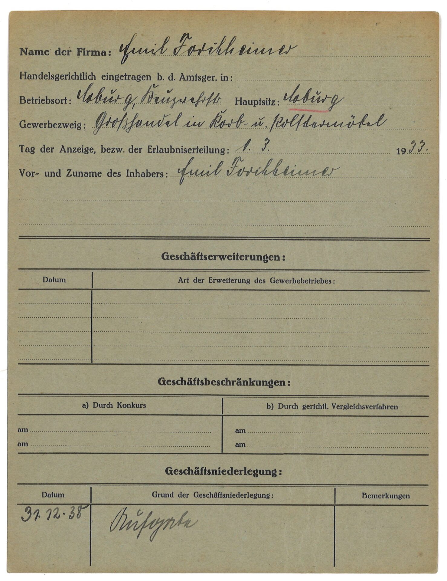 Forchheimer wurde gezwungen, eine sogenannte „Judenvermögensabgabe“ als kollektive Strafmaßnahme für das Attentat des polnisch-jüdischen Flüchtlings Herschel Grynszpan auf den deutschen Diplomaten Ernst vom Rath in Paris zu leisten. Rechtsgrundlage hierfür war die „Verordnung über eine Sühneleistung der Juden deutscher Staatsangehörigkeit“ vom 12. November 1938.[26] Am selben Tag trat auch die „Verordnung zur Ausschaltung der Juden aus dem deutschen Wirtschaftsleben“ in Kraft, die jüdischen Unternehmern das Betreiben von Gewerben untersagte. Jüdische Unternehmen mussten bis zum 31. Dezember 1938 geschlossen oder „arisiert“ werden.[27] Die Korbwarenfabrik Forchheimer fiel ebenfalls unter diese Regelung und wurde zum geforderten Zeitpunkt aufgelöst.[28]