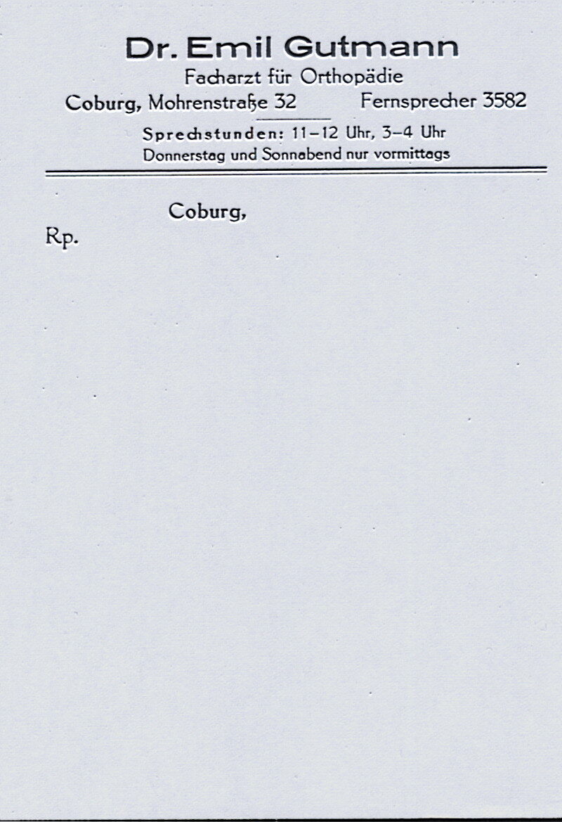 Sein Medizinstudium absolvierte Emil Gutmann an den Universitäten in München, Berlin, Kiel und Jena. Anschließend war er als Assistenzarzt an Kliniken in Mainz, Dresden und Berlin tätig. Im Jahr 1901 wurde er an der Universität Jena mit einer Arbeit zur „Kenntnis der Verdauungsprodukte des Leim“ promoviert“.[16] Im Jahr 1905 kehrte Emil Gutmann nach Coburg zurück und eröffnete in der Mohrenstraße 32 eine eigene Praxis als Facharzt für Chirurgie und Orthopädie.[17] Einen Schwerpunkt seiner Tätigkeit bildete die Behandlung von Arbeitsunfällen sowie die Erstellung medizinischer Gutachten zu Verletzungsfolgen. Aufgrund seiner fachlichen Qualifikation wurde er im Jahr 1911 vom Schiedsgericht für Arbeiterversicherung des Herzogtums Coburg als Sachverständiger bestellt.[18]