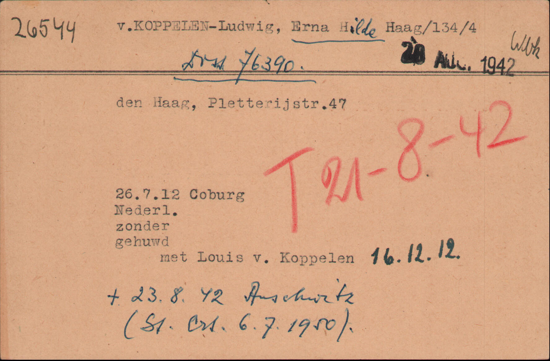 [9]  Kartei des Judenrats von Amsterdam, v. Koppelen-Ludwig, Erna H., in: Arolsen Archives (https://collections.arolsen-archives.org/de/document/130323423 (Öffnet in einem neuen Tab)), aufgerufen 12.07.2024.
