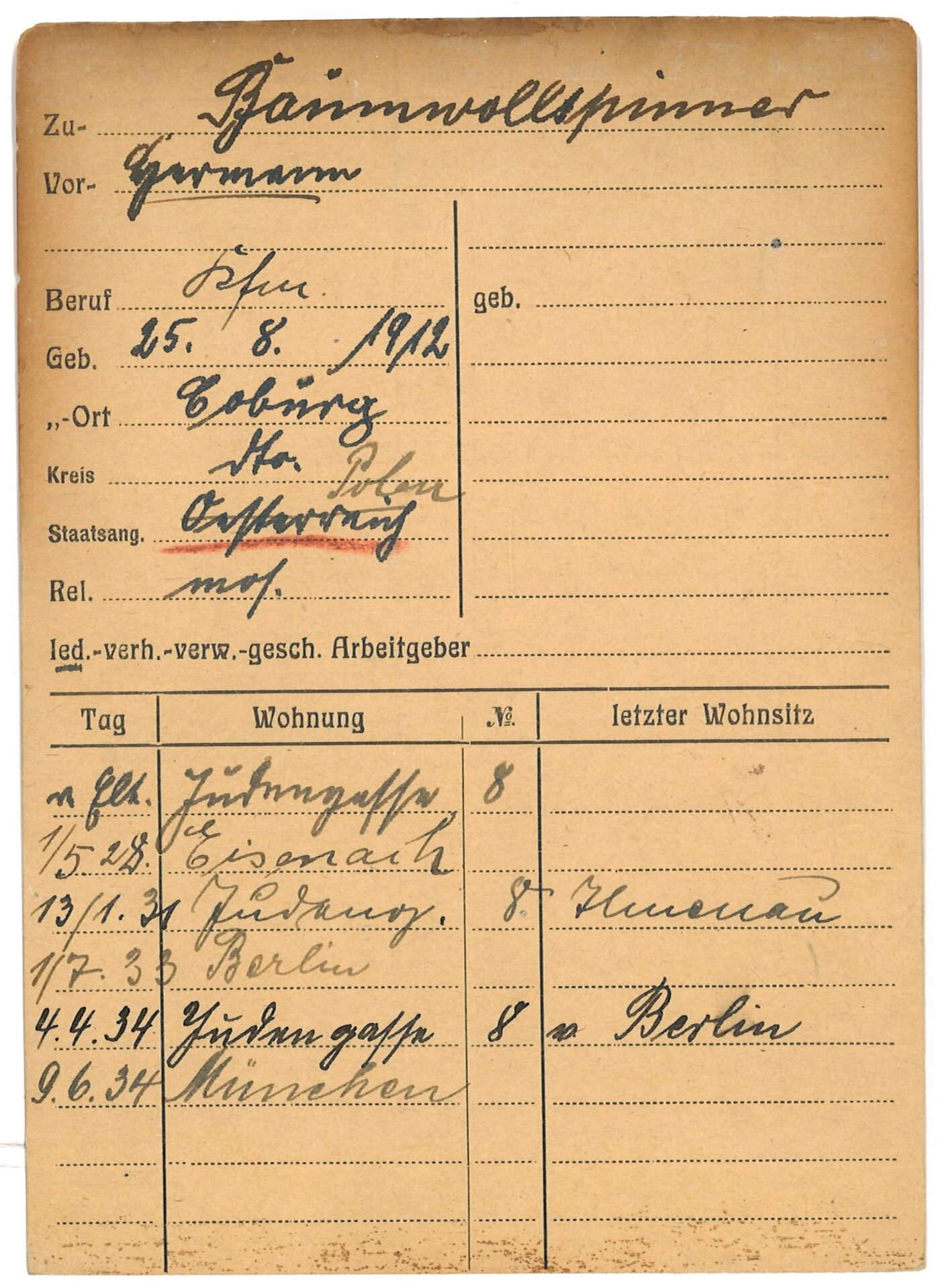 [1]   Staatsarchiv Coburg: AG Co. 53811, fol.4. Siehe auch: Stadtarchiv Coburg, Einwohnerkartei, Baumwollspinner, Hermann.
