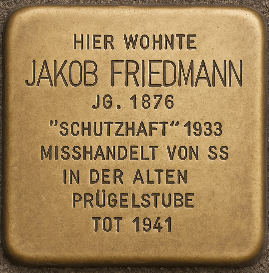 Nach der Machtübernahme Hitlers am 30. Januar 1933 verloren die Nationalsozialisten in Coburg keine Zeit, um mit den sogenannten „Feinden der Bewegung“ abzurechnen. Politische Gegner aber auch Juden wurden verhaftet. Zwischen dem 9.März und bis zum 24.April kam es zu 184 Festnahmen. Im März 1933 wurde auch Jakob Friedmann von Mitgliedern der SA festgenommen, die in Coburg als sogenannte „Not‑Polizisten“ eingesetzt worden waren. Er wurde in „Schutzhaft“ genommen – eine willkürliche, repressive Praxis ohne rechtliche Grundlage, die systematisch der Verfolgung von Juden und politischen Gegnern diente und später in die Errichtung von Konzentrationslagern und die industrielle Vernichtung mündete.[23] Jakob Friedmann wurde in die „Prügelstube“ im Polizeigebäude an der Rosengasse gebracht, einem Ort der Einschüchterung und physischen Gewalt. In der Nacht vom 25. auf den 26. März erlitt er schwere Misshandlungen, deren Spuren ihn zeitlebens begleiteten. Ein Zeugnis aus dem sogenannten „Prügel‑Stubenprozess“ von 1951 berichtet:“: