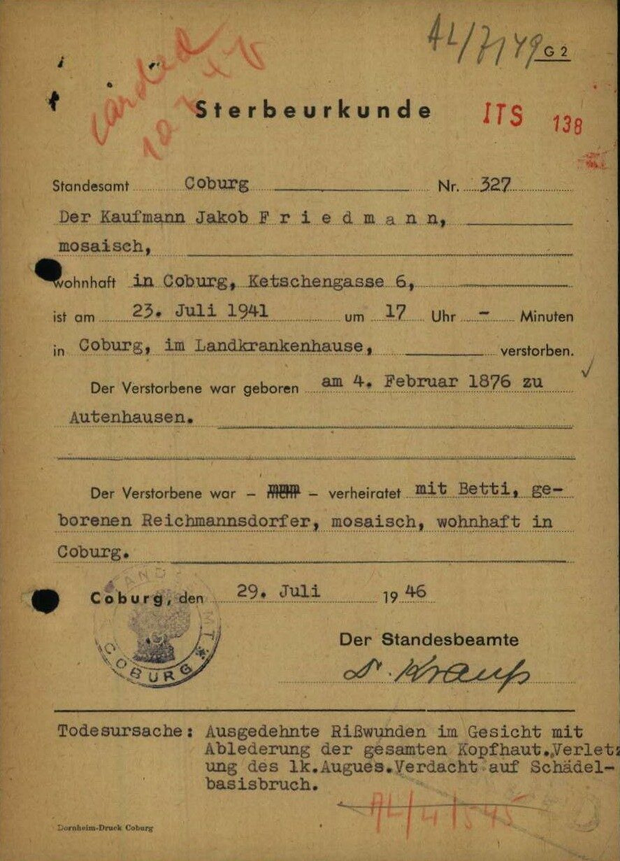 Im Sterbebucheintrag wurde als Todesursache vermerkt: „Ausgedehnte Rißwunden im Gesicht mit Ablederung der gesamten Kopfhaut. Verletzung d.lk. Auges. Verdacht auf Schädelbasisbruch“.[37] Ob diese Verletzungen auf Gewalteinwirkung oder einen Unfall zurückzuführen sind, lässt sich heute nicht mehr eindeutig klären. In seinem Testament vom 24. Februar 1941 vermachte Jakob Friedmann sein Vermögen im Wert von 1645 RM seiner Ehefrau Betti als alleiniger Erbin.[38] Er wurde auf dem jüdischen Friedhof in Coburg beigesetzt.[39]