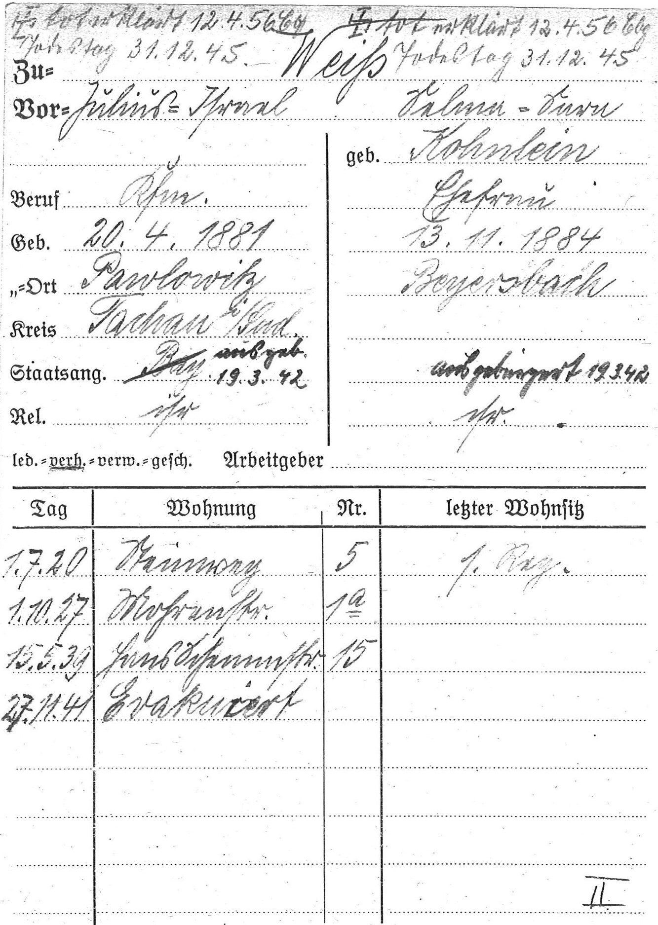 [28]  Stadtarchiv Coburg: Einwohnermeldekarte Weiß, Julius und Selma.