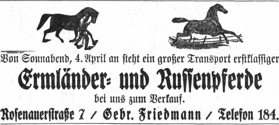 Dort eröffnete Karl Friedmann im gleichen Jahr, zusammen mit seinem Bruder Hugo, der in Hildburghausen geblieben war, eine eigene Pferdehandlung unter dem Namen „Gebrüder Friedmann“.[11] Das Unternehmen dürfte in den folgenden Jahren aufgrund des im ganzen Land spürbaren Wirtschaftswachstums sehr erfolgreich agiert haben, sodass sich Möglichkeiten einer Expansion ergaben. So gründeten Karl und Hugo Friedmann Anfang 1914 gemeinsam mit dem Kaufmann Moritz Seligmann in Coburg die Firma „Seligmann & Friedmann OHG“.[12] Das Unternehmen spezialisierte sich auf den Handel mit Vieh, Pferden und Hopfen und ermöglichte es Karl, sich in der Coburger Geschäftswelt zu etablieren. Später eröffneten die Brüder eine Filiale ihrer Pferdehandlung in Coburg. Seit 1924 befand sich diese im Haus Rosenauer Straße 15 und wurde von Hugo Friedmann geleitet.[13]