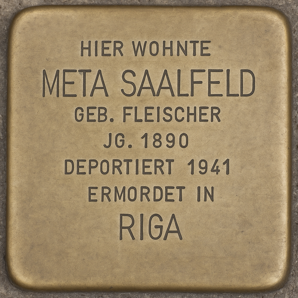 Mit der Ankunft in Jungfernhof verliert sich die Spur von Meta Saalfeld. Wann sie starb, lässt sich anhand fehlender Unterlagen nicht mehr ermitteln. Ihr Vermögen, bestehend aus verschiedenen Gegenständen, Wertpapieren, Bildern und einem Bankkonto, fiel aufgrund einer Weisung des Reichsfinanzministeriums vom November 1941 unter dem Decknamen „Aktion 3“ weitgehend dem Deutschen Reich zu.[26] Ein Teil des Besitzes wurde aber auch von lokalen Behörden einbehalten: So ersetzte der Stadtrechtsrat Schulze-Döbold sein Arbeitszimmer im Rathaus durch das Herrenzimmer der Familie Saalfeld.[27] Ein Zimmerteppich ging an Oberbürgermeister August Greim, der fortan das Arbeitszimmer des Stadtoberhaupts schmückte. Die Städtischen Sammlungen erhielten aus dem Saalfeldischen Besitz einen Stahlstich im Wert von 15 Reichsmark und eine Zeichnung im Wert von drei Reichsmark.[28]