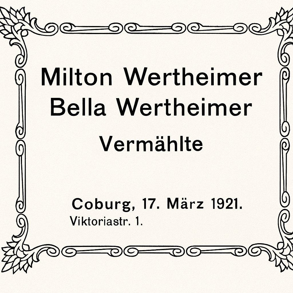 Nach dem Ende seines Militärdienstes heiratete Milton Wertheimer am 16. März 1921 in Coburg seine Cousine 2. Grades Bella Wertheimer (Öffnet in einem neuen Tab).[9] Die Großväter väterlicherseits waren Brüder. Eine solche Verehelichung war damals nichts ungewöhnliches. Bella wurde am 17. Dezember 1890 in Themar geboren.[10] Seine Schwiegereltern waren Nathan Wertheimer, geboren am 17. April 1859 in Marisfeld (Herzogtum Meiningen) und Malwine Wertheimer, geborene Frankenberg, am 19. Oktober 1859 ebenfalls in Marisfeld geboren. Die wohl arrangierte Ehe blieb kinderlos.