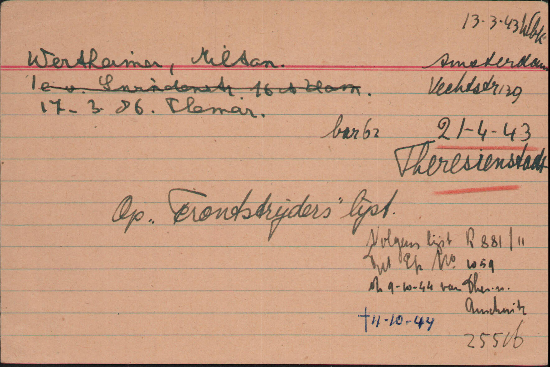 [32] Judenrat von Amsterdam, Judenkartei, Wertheimer, Milton, in: Arolsen Archives https://collections.arolsen-archives.org/de/document/130398771 (Öffnet in einem neuen Tab) (letzter Zugriff: 16.09.2024); Siehe auch: List of 1,600 Jews deported from the Theresienstadt Ghetto to Auschwitz on Transport Ep, 09/10/1944, S.16, 53, abgerufen bei: https://collections.yadvashem.org/en/documents/3690767 (Öffnet in einem neuen Tab) (letzter Zugriff: 24.09.2024).