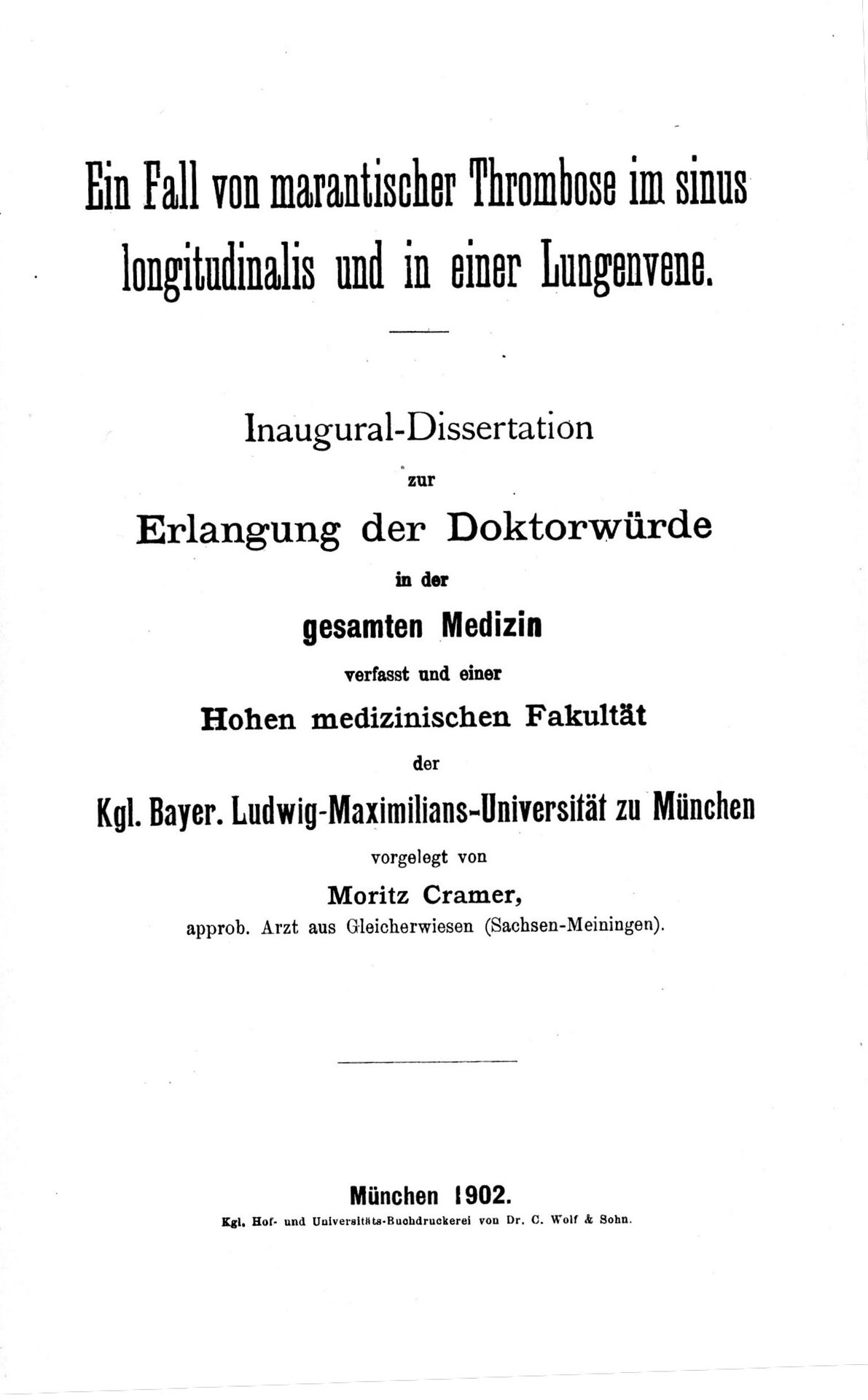 [11]   Moritz Cramer, Ein Fall von marantischer Thrombose im sinus longitudinalis und in einer Lungenvene, München 1902.; Siehe auch: Universitätsarchiv München: G-IX-7, Bd.18, Diplom Nr.6708.
