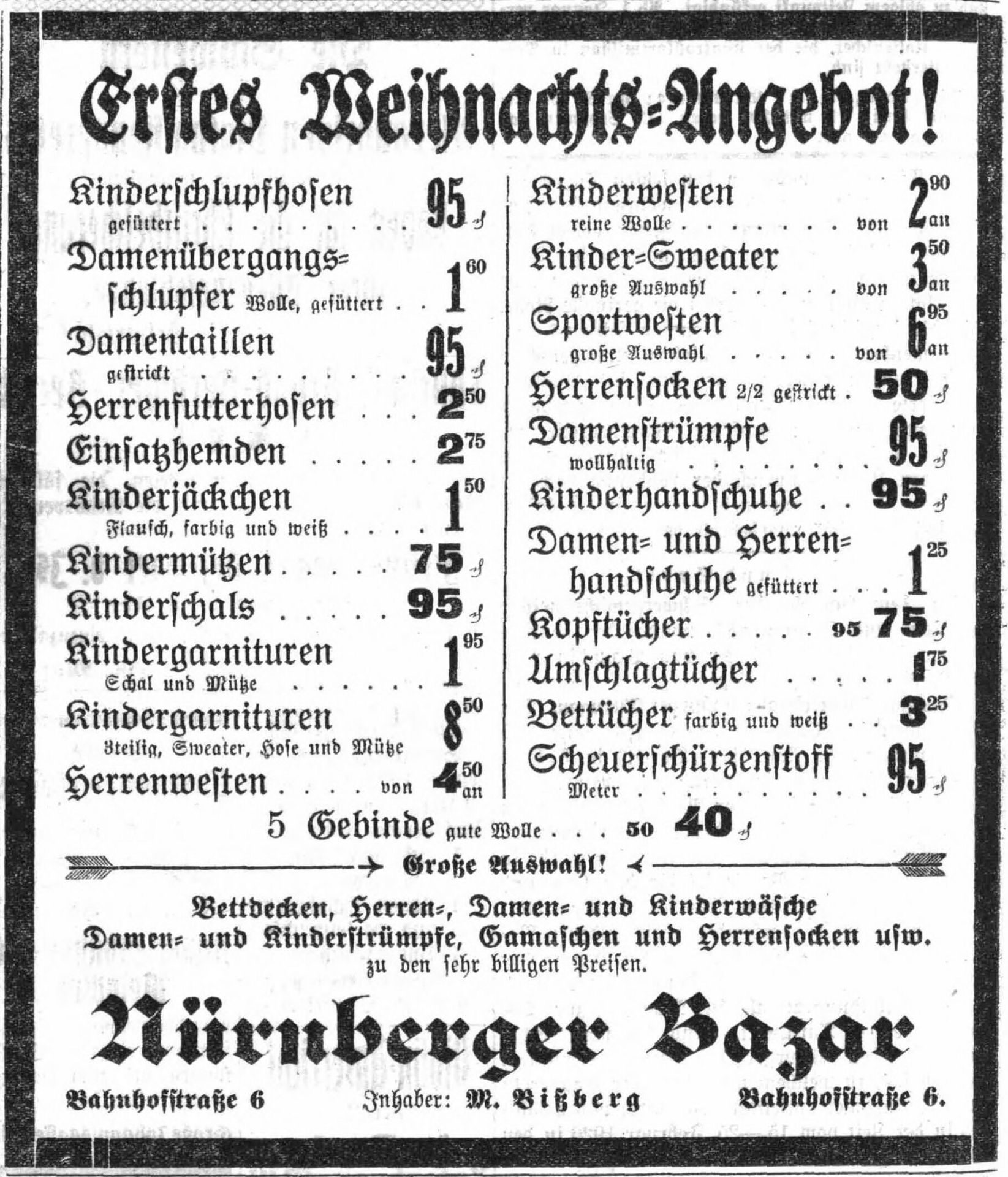 [12]  Stadtarchiv Coburg: Einwohnermeldekarte, Bissberg, Moritz und Felice; Siehe auch: Staatsarchiv Coburg: AG Co. 38687, fol.2-4,6; Temporär war der Standort des Geschäftes die Bahnhofstraße 6 bzw. Unterer Bürglaß 14 siehe hierzu: „Coburger Zeitung“ vom 3. Dezember 1925 sowie „Coburger Zeitung“ vom 9. November 1928; Siehe auch: Einwohner der Stadt Coburg mit Anhang: Einwohnerbuch des Landbezirks, Coburg [1927], S.39.