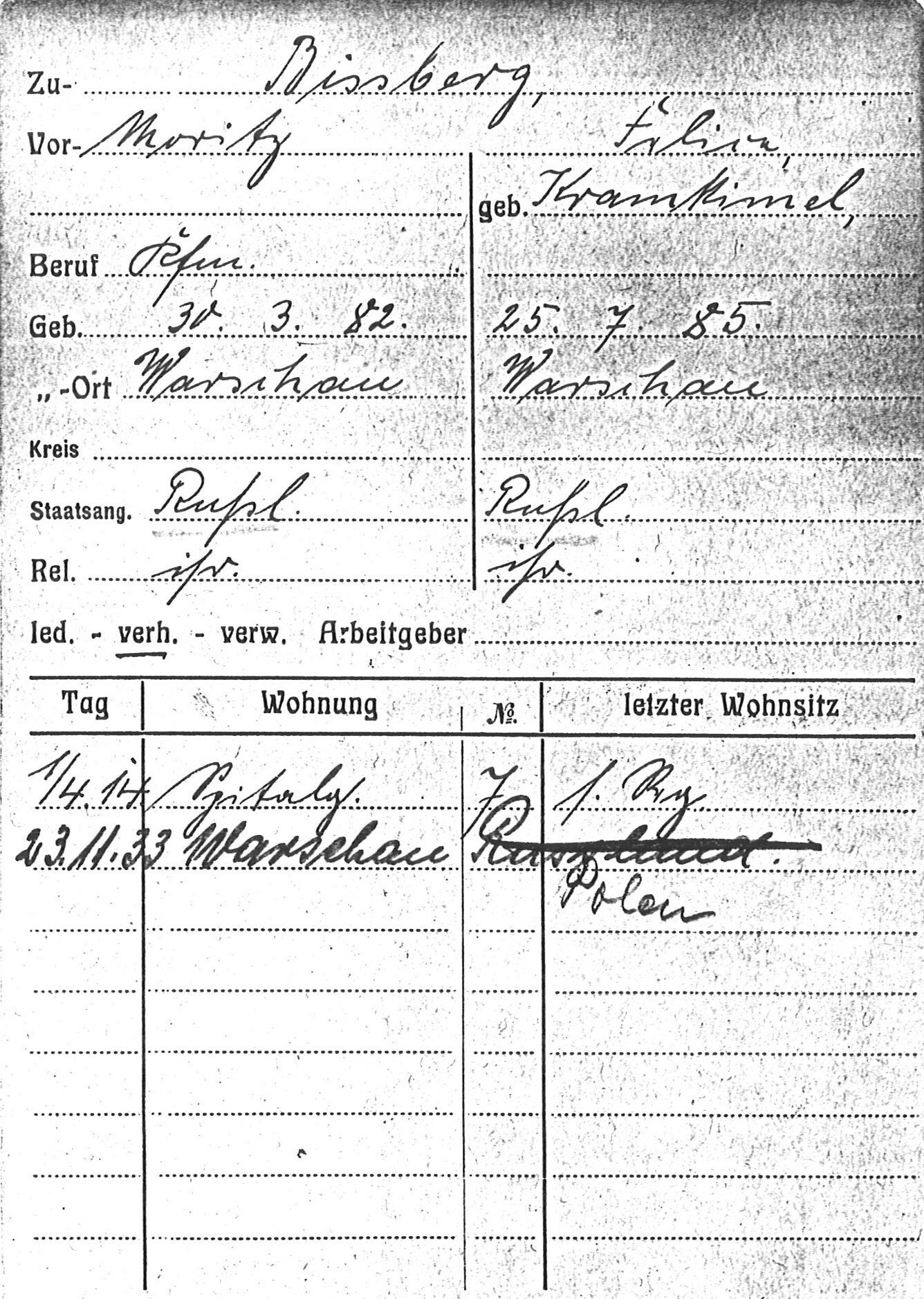 Während Isidor Bissberg bereits Ende Mai 1933 in die Schweiz geflohen war[30], blieben seine Eltern zunächst im Deutschen Reich. Laut der Einwohnermeldekarte von Moritz und Felice Bissberg kehrten sie im November 1933 nach Warschau zurück.[31] Ein überlebender Neffe, Henryk Bursztyn, berichtete jedoch nach dem Krieg, dass sein Onkel und seine Tante sich bis zu ihrer Ausweisung 1935 in Deutschland aufgehalten hätten – ihre Aufenthaltsgenehmigung war ihnen schließlich entzogen worden. Erst zu diesem Zeitpunkt seien Moritz und Felice Bissberg gemeinsam mit ihrem Sohn nach Warschau zurückgekehrt.[32]
