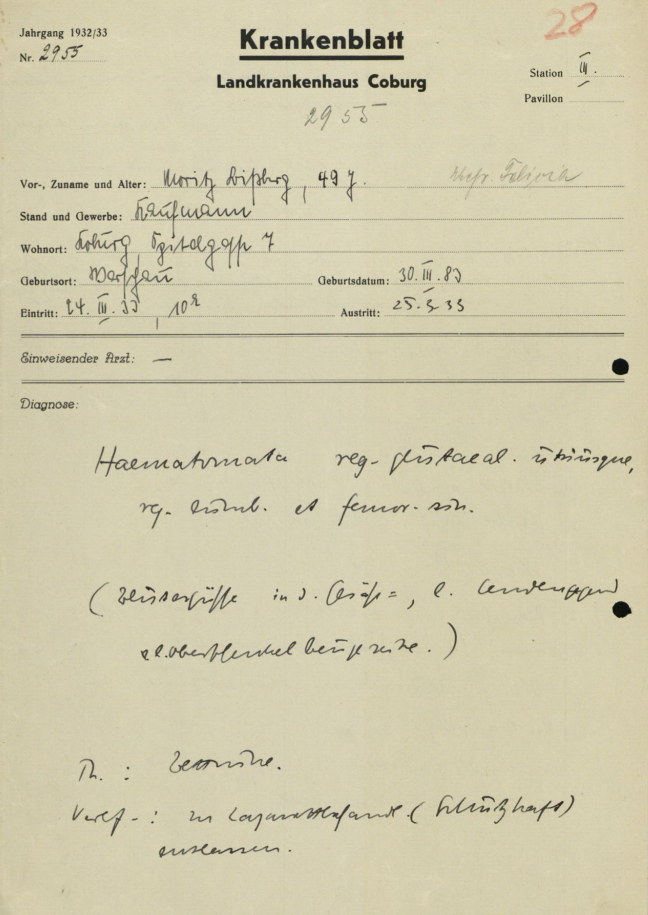 Krankenblatt von Moritz Bissberg nach seiner Misshandlung in der Prügelstube 1933