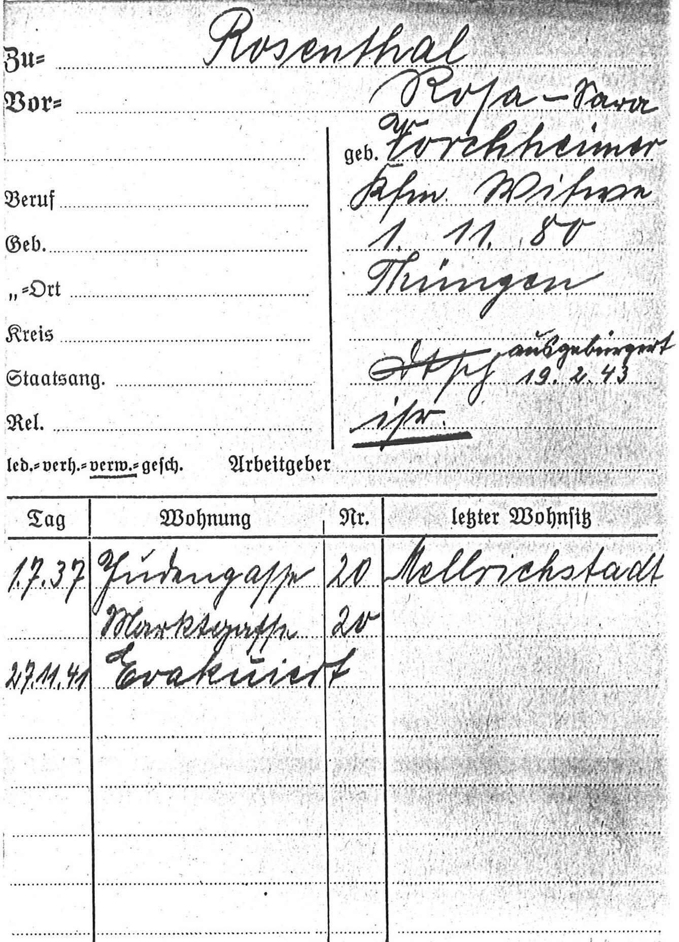 [1] Stadtarchiv Coburg, Einwohnermeldekartei, Rosenthal, Rosa.