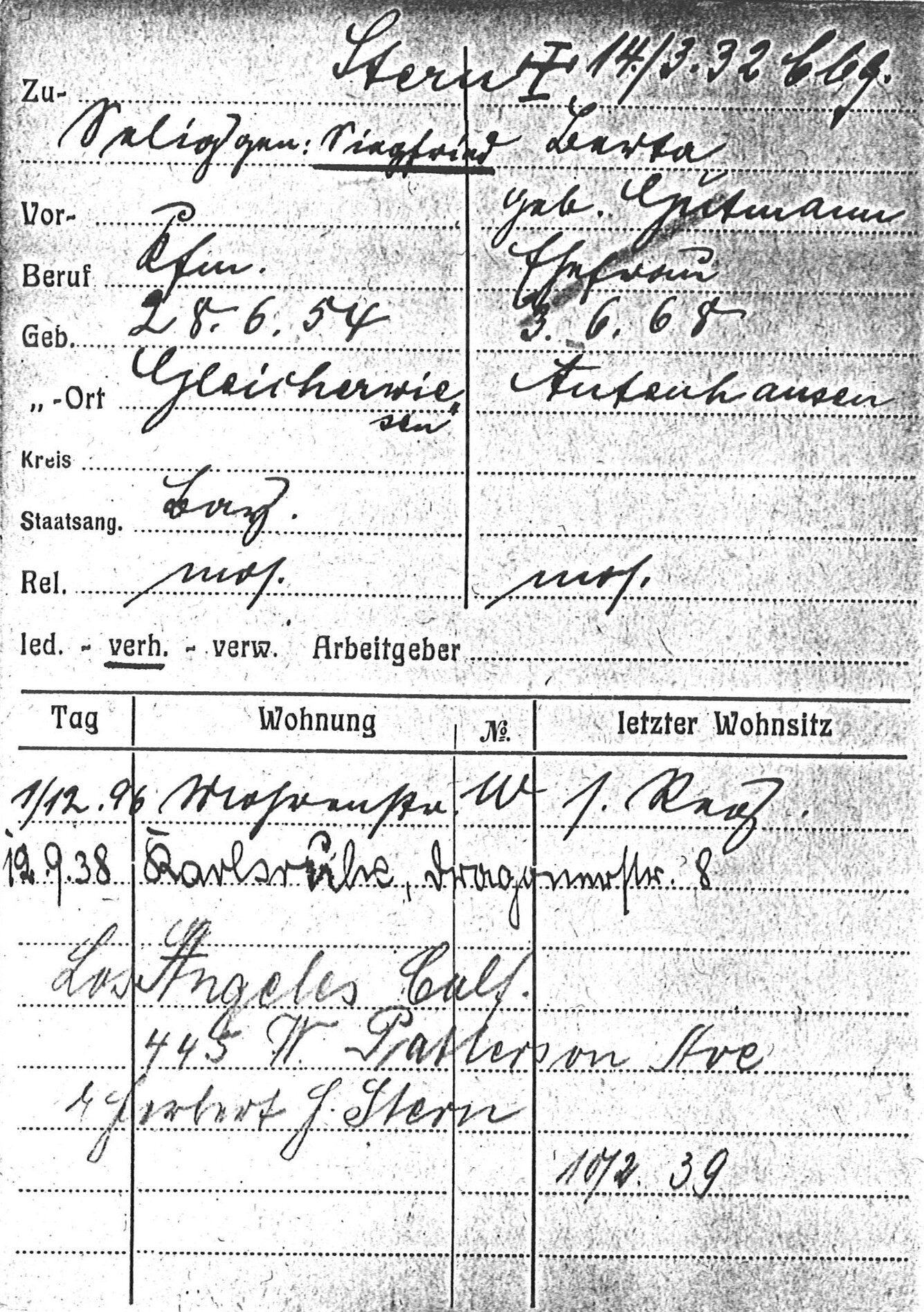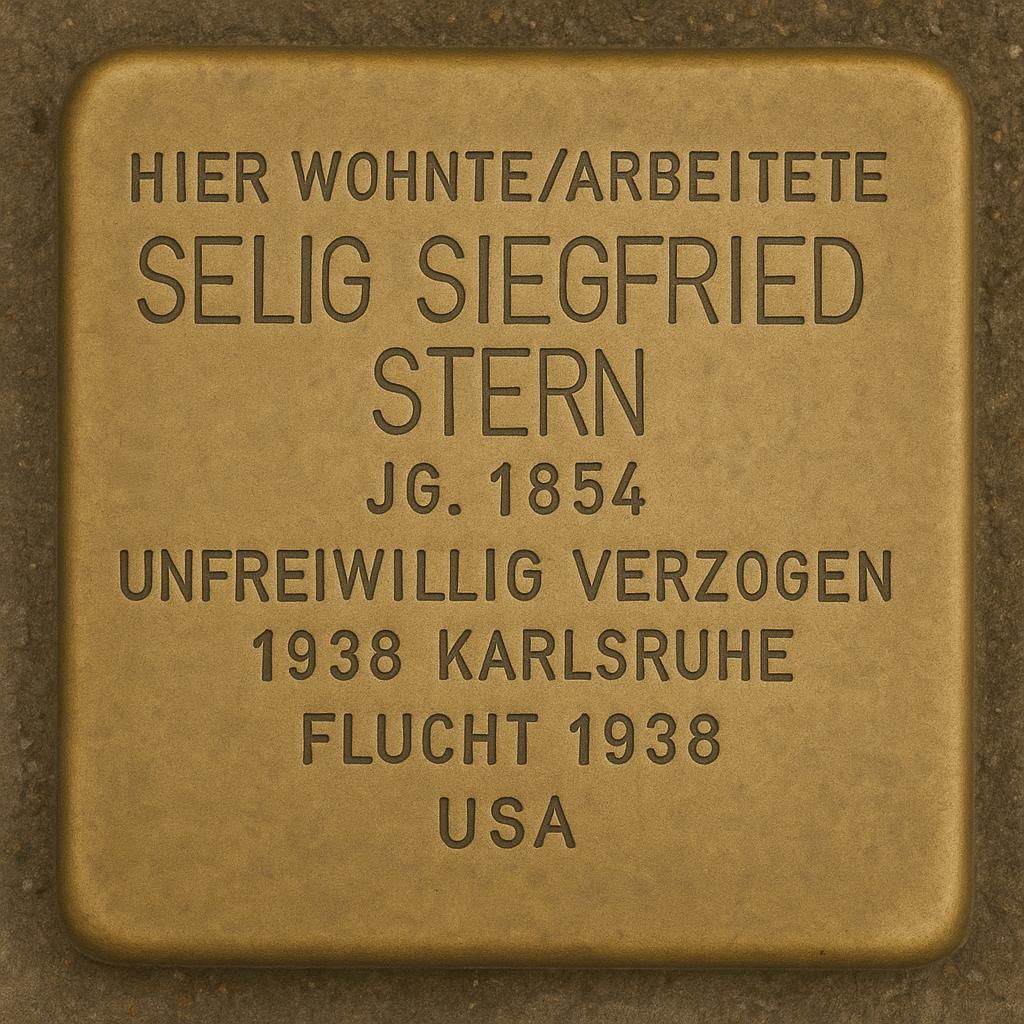 Nach dem erzwungenen Verkauf seines Hauses verließ Selig Stern im September 1938 Coburg.[30] Seine Ehefrau Bertha war bereits im März 1932 im Alter von 63 Jahren verstorben. Infolgedessen war Stern alleinstehend und zog zu seinem Sohn Kurt, der mit seiner Familie in Karlsruhe lebte.[31]