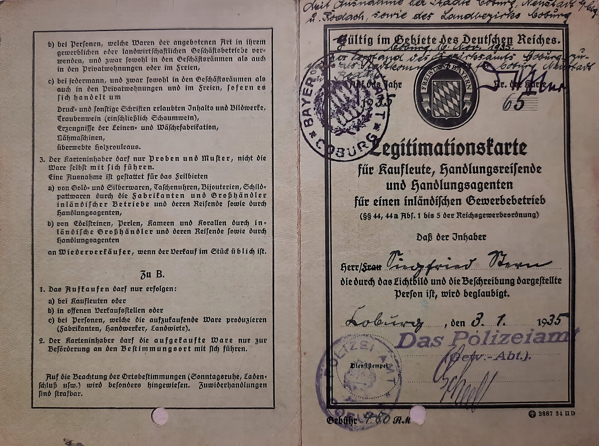 Parallel dazu intensivierte die Stadt Coburg ihre Bemühungen, den jüdischen Viehhandel vollständig zu unterbinden. Im Herbst 1935 entzog die Stadtverwaltung mehreren jüdischen Viehhändlern, darunter auch Stern, die Gewerbeerlaubnis. Diese Maßnahme war formal juristisch umstritten und stieß auf Widerspruch beim Regierungspräsidium in Bayreuth, das für den Bezirk Oberfranken zuständig war. Infolgedessen wurde die vollständige Maßnahme teilweise zurückgenommen: Drei jüdische Viehhändler erhielten ihre Konzession unter strengen Auflagen zurück, darunter regelmäßige Kontrolle und die Androhung sofortiger Suspendierung bei geringfügigen Verstößen.[25]