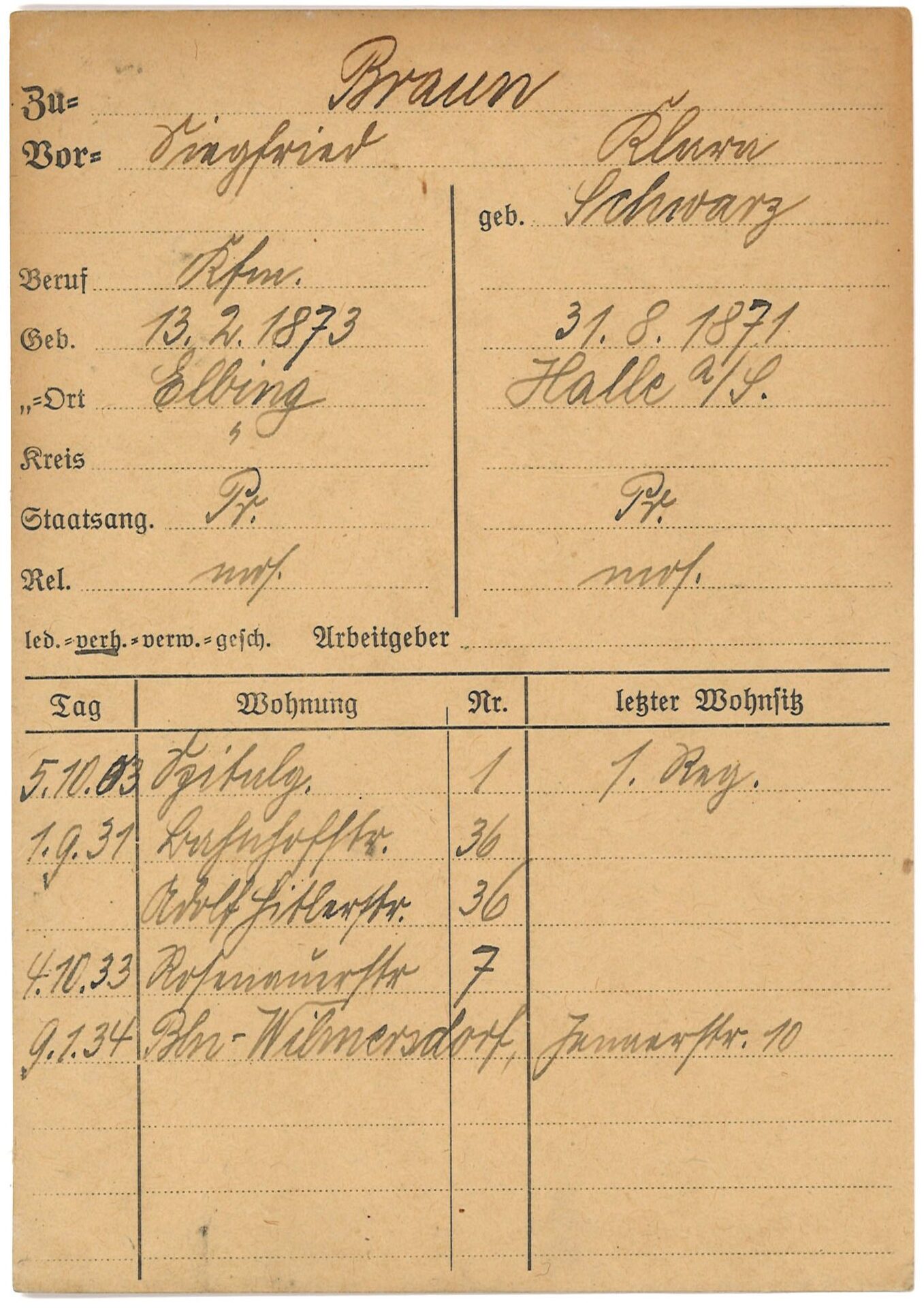 Die anhaltende Angst vor weiteren Misshandlungen und antisemitischen Übergriffen führte im Herbst 1933 dazu, dass das Ehepaar Braun seine Wohnung in der Bahnhofstraße 36 in Coburg aufgab. Sie hatten diese Wohnung seit 1931 bewohnt. Für eine Übergangszeit fanden die Brauns eine Unterkunft im Haus der jüdischen Pferdehändler Karl (Öffnet in einem neuen Tab) und Hugo Friedmann in der Rosenauer Straße 15.[20] Auch diese Phase ihres Aufenthalts war durch Unsicherheit geprägt. Unter dem Eindruck der verschärften Repressionen entschieden sich Siegfried und Klara Braun Ende 1933, die Vestestadt endgültig zu verlassen. Anfang Januar 1934 kehrten sie nach Berlin zurück, von wo sie 37 Jahre zuvor nach Coburg gezogen waren [21] Ihre Rückkehr in die Reichshauptstadt stellt keine freiwillige Rückwanderung im klassischen Sinn dar, sondern diente wohl als eine Schutzmaßnahme angesichts der lokalen Verfolgung.