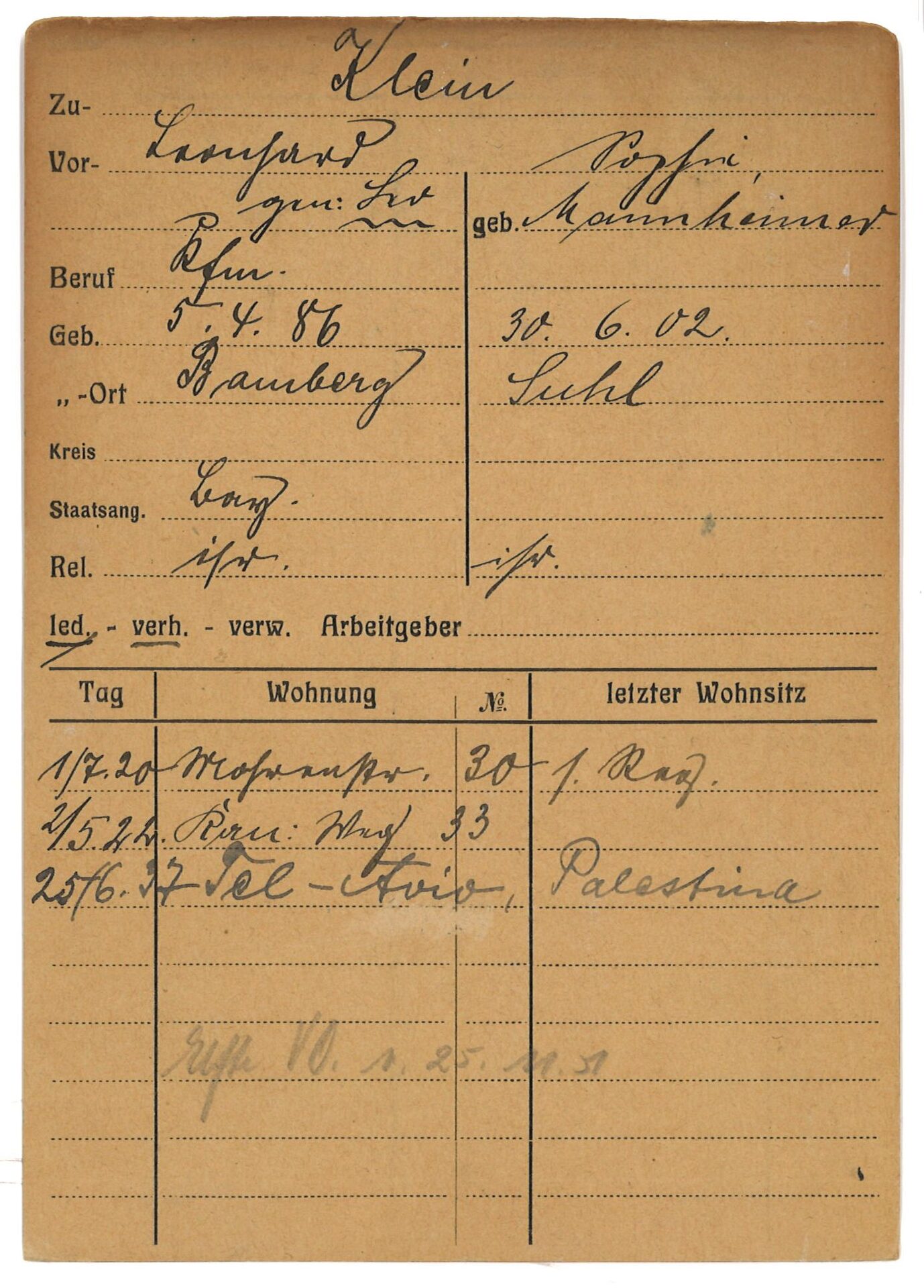 Wegen der sich seit 1933 verschärfenden antisemitischen Verfolgung und der zunehmenden wirtschaftlichen Ausgrenzung entschloss sich die Familie Klein, Deutschland zu verlassen. Bereits 1936 konnten die beiden älteren Kinder Gerhard und Ursula nach Palästina emigrieren. Nach derzeitigem Forschungsstand geschah dies mit hoher Wahrscheinlichkeit im Rahmen eines von der Jugend-Alijah organisierten Transportes, der jüdischen Kindern und Jugendlichen die Auswanderung ermöglichte.[33] Am 25. Juni 1937 verließen auch Sophie Klein, ihr Ehemann Leonhard und die jüngste Tochter Rosemarie Coburg.[34] Sie kamen 5. Juli in Tel Aviv an.[35]