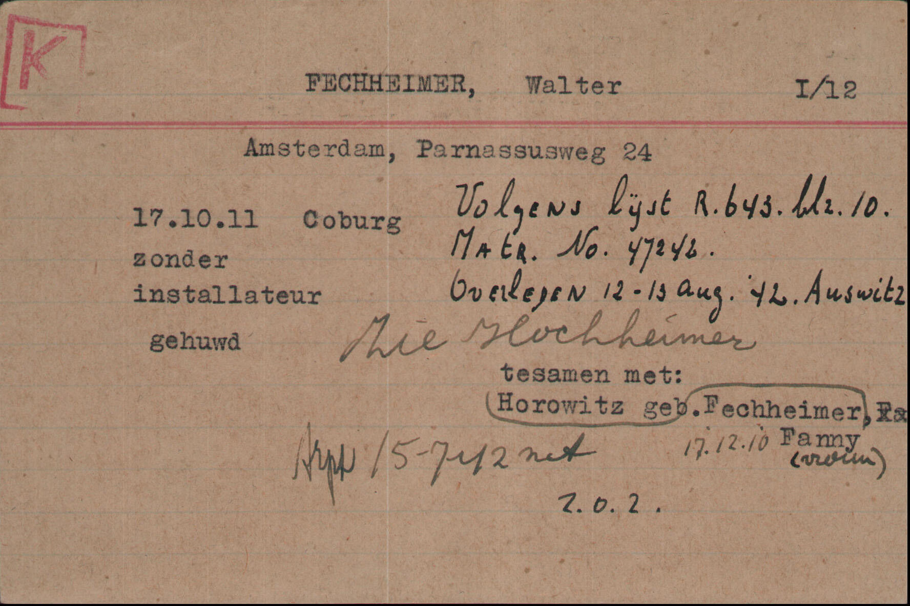 [26] Kartei des Judenrats von Amsterdam, v. Fechheimer, Walter in: Arolsen Archives (https://collections.arolsen-archives.org/de/document/130285272 (Öffnet in einem neuen Tab)), aufgerufen am 26.09.2025; Kartei des Judenrats von Amsterdam v. Horowitz, geb. Fechheimer, Fanny (https://collections.arolsen-archives.org/de/document/130285271 (Öffnet in einem neuen Tab)), aufgerufen am 26.09.2025.