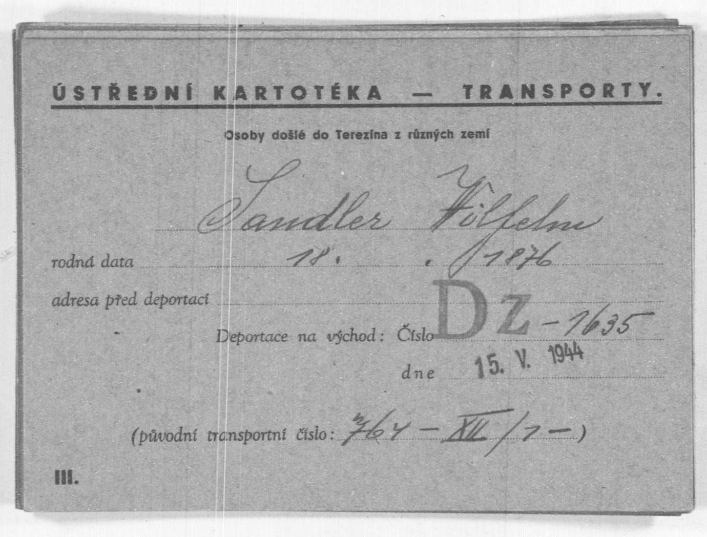 Der Transport mit der Kennung Da 503 (Transport XII/1) brachte Wilhelm Sandler über Erfurt und Dresden in das Konzentrationslager Theresienstadt. Neben Sandler wurden 677 weitere Bewohner von jüdischen Altersheimen deportiert. Am nächsten Tag erreichte der Zug den Bahnhof von Bohušovice. Bis dahin waren bereits elf ältere Deportierte gestorben. In Bohušovice wurden die Deportierten gezwungen, den Zug zu verlassen und die letzten drei Kilometer nach Theresienstadt mit ihrem Gepäck zu Fuß zurückzulegen. Gehbehinderte wurden in Lastwagen in das Lager transportiert. Viele der Deportierten blieben nicht lange in Theresienstadt sondern wurden unter anderem in die Vernichtungslager im Osten weiterdeportiert.[33] Wilhelm Sandler blieb 20 Monate in Theresienstadt.