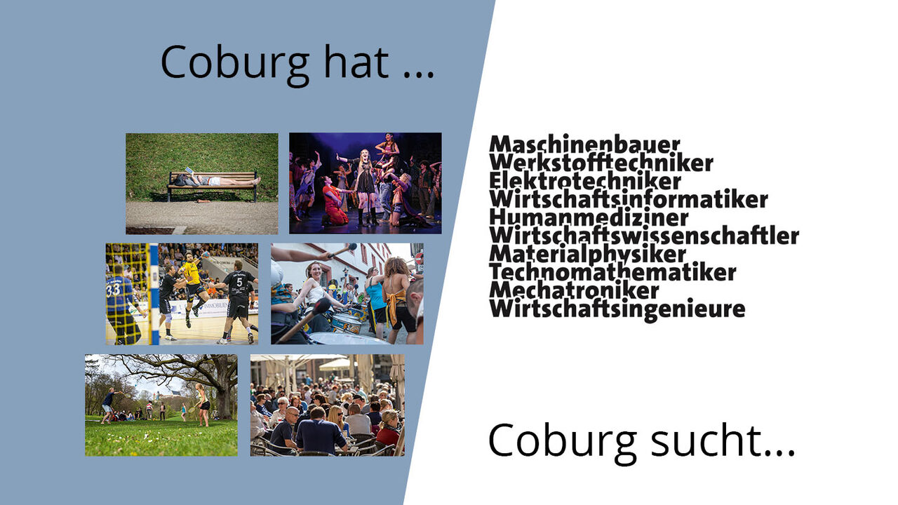 Am besten wäre, Sie bleiben gleich hier – bei uns in Coburg. Dass Sie hier reinschnuppern, zeigt uns, dass Sie den richtigen Riecher haben. Ein Gespür haben für Trends und Chancen. Denn Coburg bietet Chancen: für einen prima Start in ein erfülltes Leben!