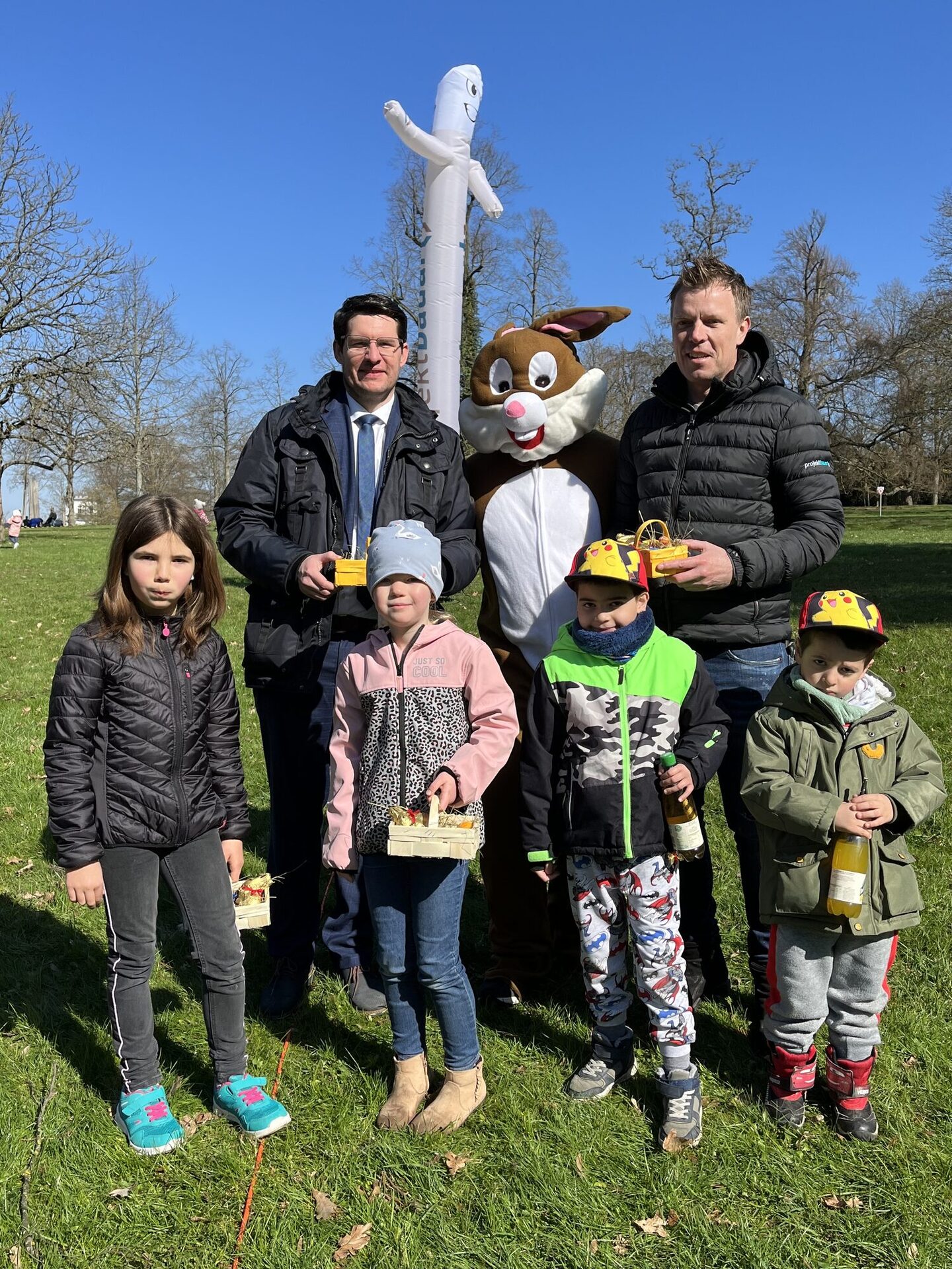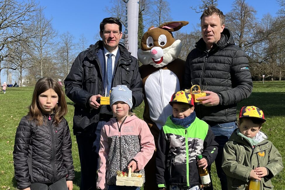 „3 – 2 – 1- Los!“ Dann stürmten die Kinder im Hofgarten los und wollten eines von über 700 Osternestern suchen. Viele Coburger Kinder hatten sich eingefunden, als Oberbürgermeister Dominik Sauerteig zusammen mit dem Osterhasen und Marcus Thiele von Projekt Bauart den Countdown herunterzählte. Zuvor hatte das Unternehmen die Nester im Bereich des Spielplatzes beim Kunstverein im Hofgarten versteckt. Das Grünflächenamt hatte die Kennzeichnung übernommen und auch ein Auge drauf, dass kein Verpackungsmüll im Hofgarten zurückbleibt.