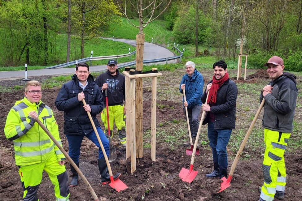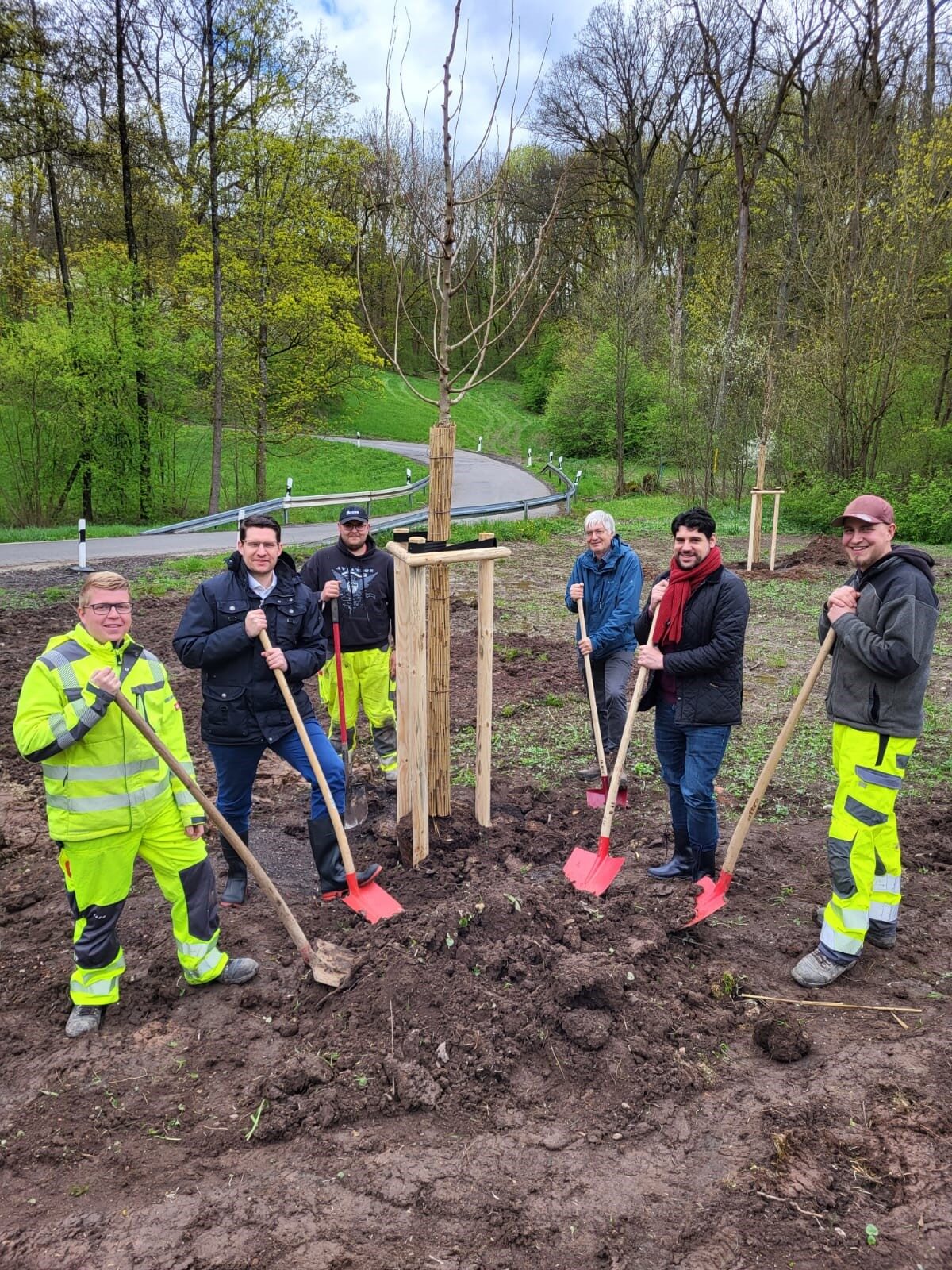 Zum Tag des Baumes haben Oberbürgermeister Dominik Sauerteig, Klimaschutzbeauftrager Stefan Sauerteig und die Mitarbeiter unseres Grünflächenamtes zu Schaufel und Spaten gegriffen. Im Kürengrund wurden drei besonders robuste Rebona-Ulmen gepflanzt.