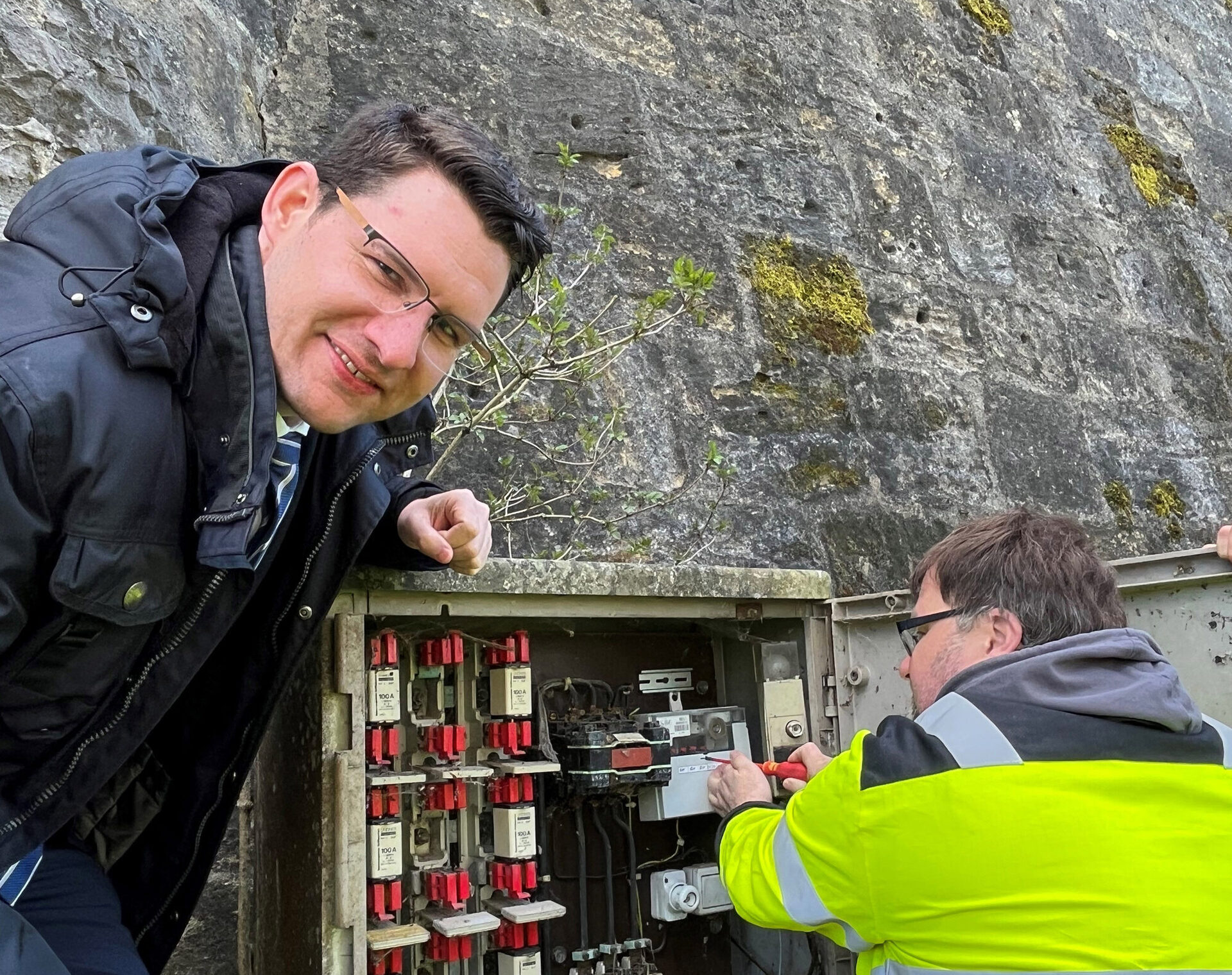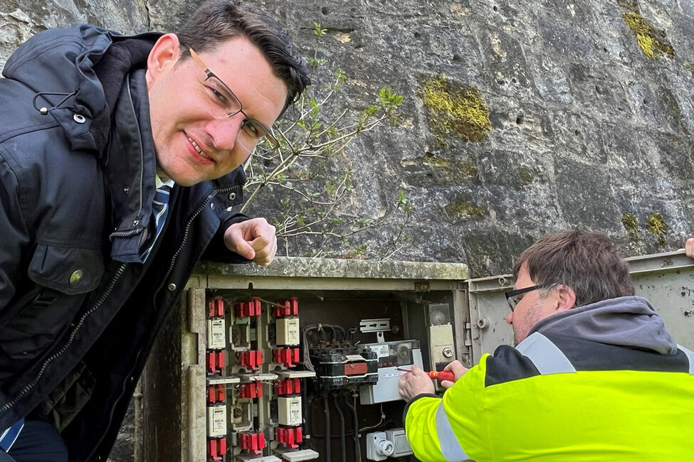 „Leider kann man hier nicht einfach einen Schalter umlegen“, erklärte Mario Röder, Fachmann von der SÜC, die für die Beleuchtung in der Stadt zuständig sind. Die elektrischen Steuergeräte der Beleuchtung mussten per Hand vom Strom abgeklemmt werden, da es von diesen Steuergeräten in der Stadt tausende gibt. Sie regeln Licht, PV-Anlagen und vieles Weitere. „Nur durch das Abklemmen konnten wir sicherstellen, dass nicht auch andere für die Sicherheit wichtige Beleuchtungen mit ausgeschaltet wurden“, erklärte Röder. Nun wurden die Steuergeräte an der Veste wieder per Hand angeklemmt.