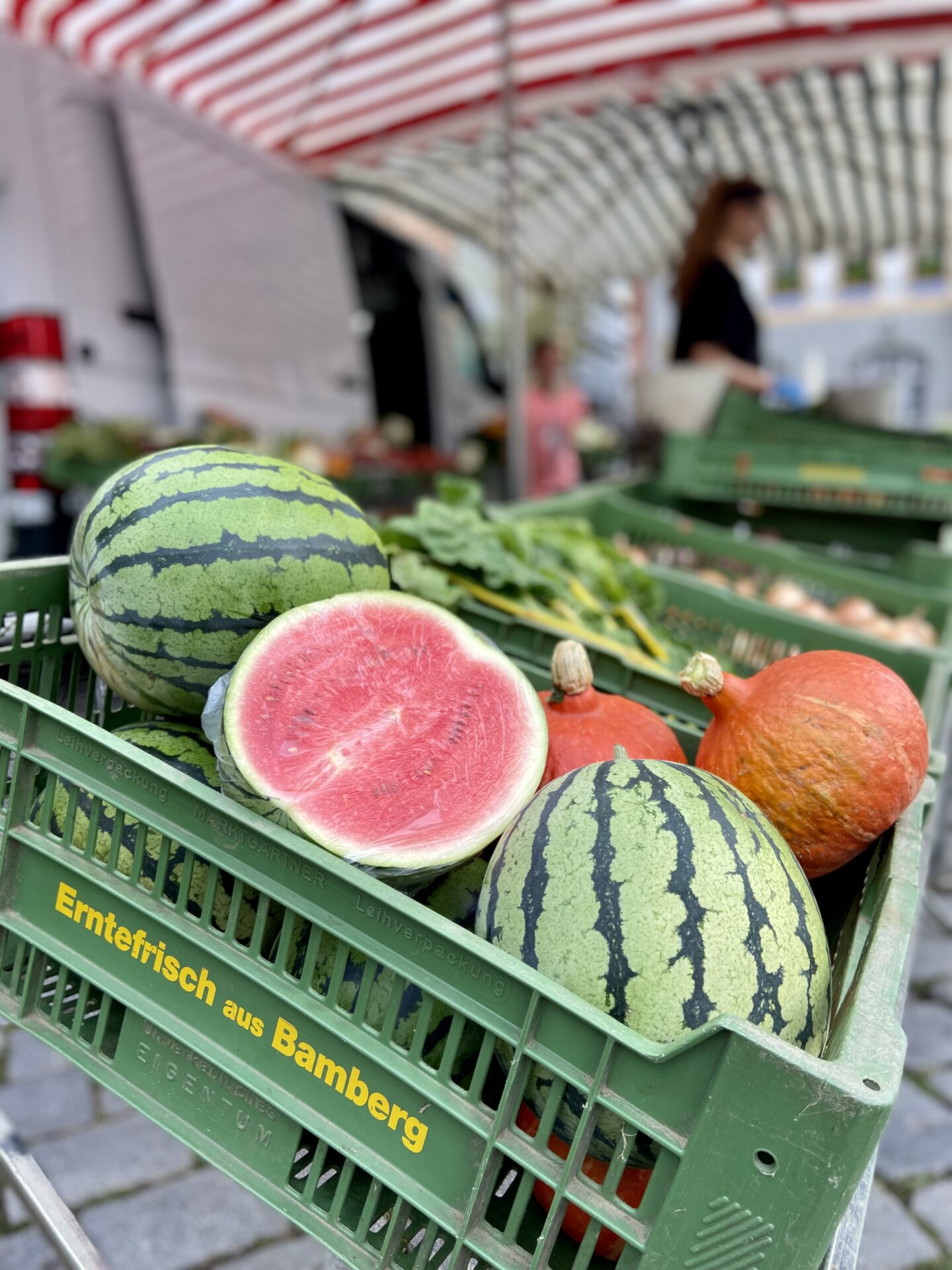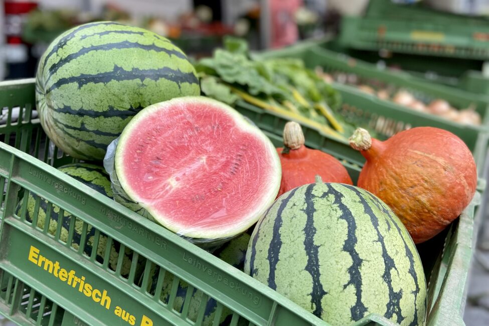 Bei Hitze sind sie eine beliebte Erfrischung: Die Wassermelone. Bisher hatte sie bei unseren regionalen Markthändler*innen keinen Platz, denn sie haben nur Waren von hier. Aber das ändert sich jetzt. Direkt aus Hallstadt kommen Wassermelonen immer Dienstag und Freitag frisch auf den Coburger Marktplatz.