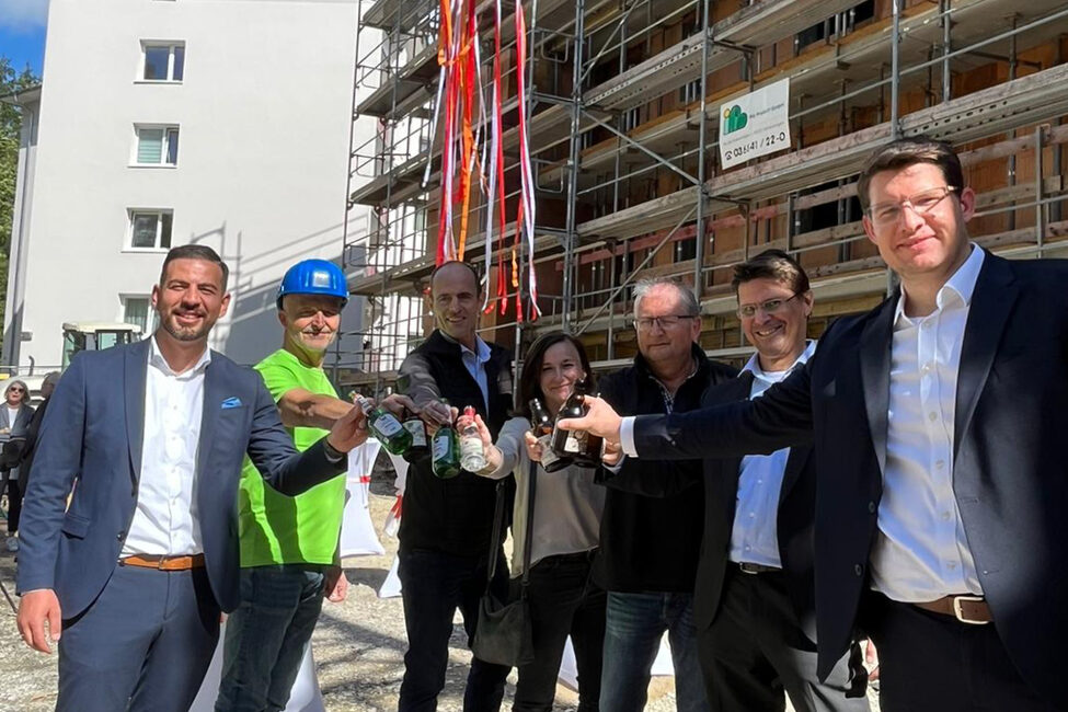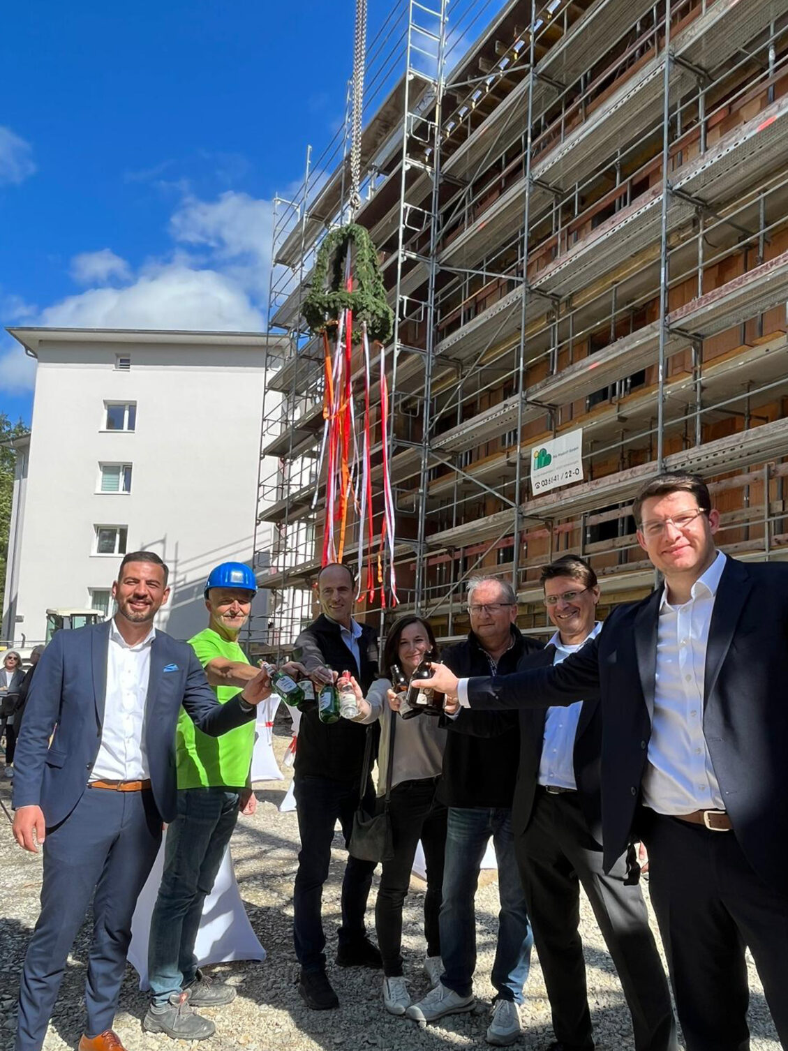 In der Von-Mayer-Straße steht der Rohbau für 27 neue Wohnungen. Am Donnerstag hat die Wohnbau gemeinsam mit Oberbürgermeister Dominik Sauerteig und 3. Bürgermeister Can Aydin Richtfest gefeiert. Hier entstehen 27 sozialgebundene Wohnungen mit einer Gesamtwohnfläche von 2100 Quadratmetern. Die Miete wird, wie für alle sozialgebundenen Wohnungen der WSCO, rund fünf Euro betragen. Die Fertigstellung ist für Oktober 2024 geplant.