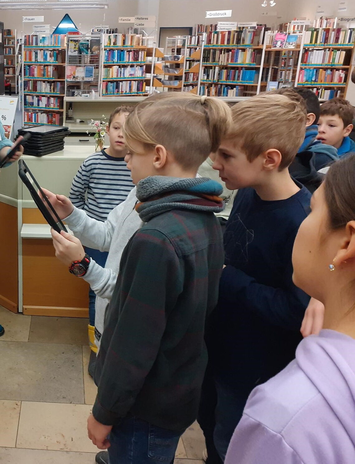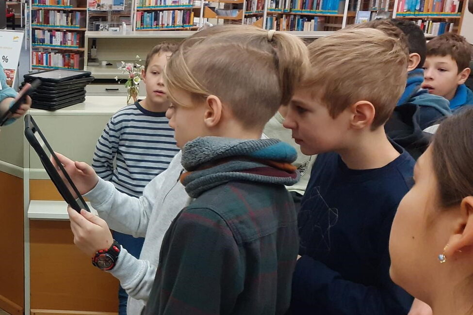 Die Klasse 5b des Gymnasium Ernestinum besuchte im Januar die Stadtbücherei Coburg und war vom neuen Angebot spontan begeistert, auch Lehrerin Katharina Stenzel vom Gymnasium Ernestinum: „Was es hier Neues zu erfahren gibt? Eine ganze Menge! Als erste Klasse durften wir die neu entwickelte interaktive Führung mittels Tablets und der App Actionbound durchführen.“