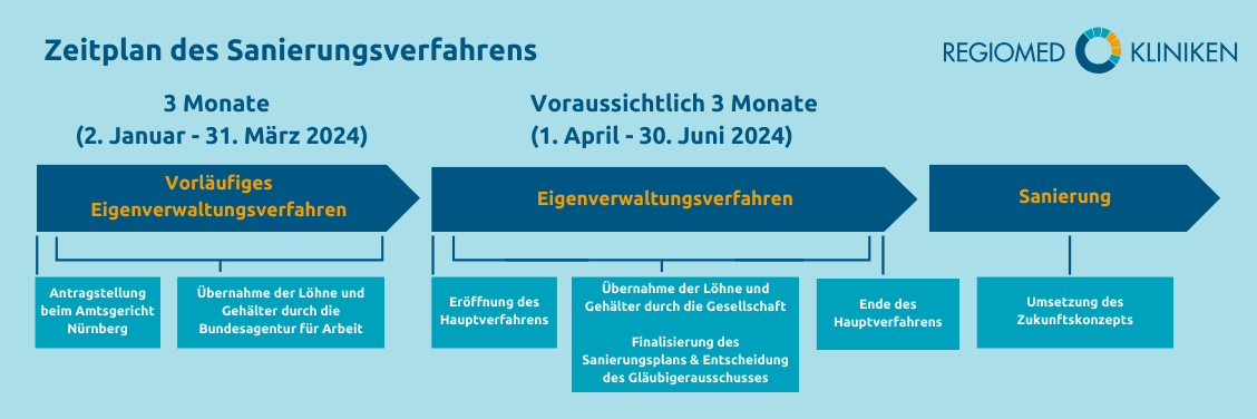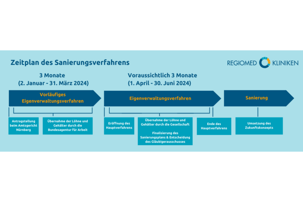 Die Führungskräfte von Regiomed legen besonderen Wert auf das Wohlergehen der Mitarbeiterinnen und Mitarbeiter sowie der Patientinnen und Patienten. Das Hauptverfahren der Eigenverwaltungsinsolvenz wird bis zum 30. Juni abgeschlossen sein. Ungeachtet der laufenden Verfahren wird der Klinikbetrieb fortgesetzt und die Auszahlung der Gehälter der Mitarbeiterinnen und Mitarbeiter bleibt gewährleistet.