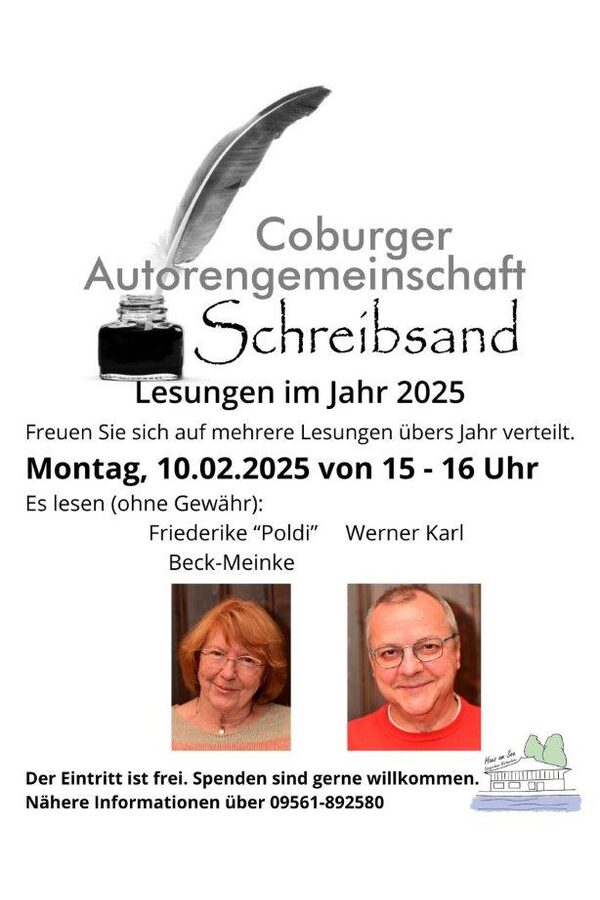 Mitgliedern der Coburger Autorengruppe Schreibsand lesent wieder im Haus am See in Wüstenahorn. Diesmal werden vsl. Friederike "Poldi" Beck-Meinke und Werner Karl aus ihren Werken vortragen.