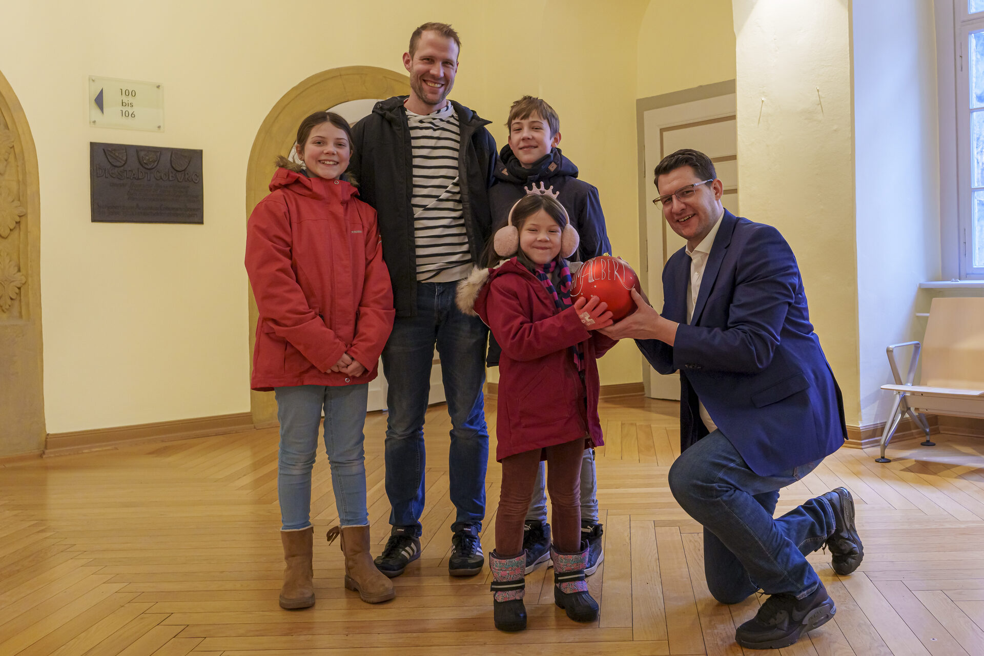 Direkt nach Schulschluss am Freitag stapft Familie Koch durch den Schnee auf dem Marktplatz. OB Dominik Sauerteig begrüßt Irma, Hilda, Edwin und Papa Tobias. Sie alle hatten sich Ende November von ihrer Serbischen Fichte verabschiedet und sie der Stadt Coburg für den Weihnachtsmarkt geschenkt. Der Oberbürgermeister bedankte sich für dieses Geschenk mit einer der Schmalbert-Kugeln. Den Namen finden übrigens alle richtig klasse, denn der Baum war ja schmal. „Aber geschmückt und zwischen den Buden hat er richtig toll ausgesehen. Wir haben auch viele Fotos gemacht und da kommt die Kugel jetzt auch dazu“, verrät Tobias Koch.