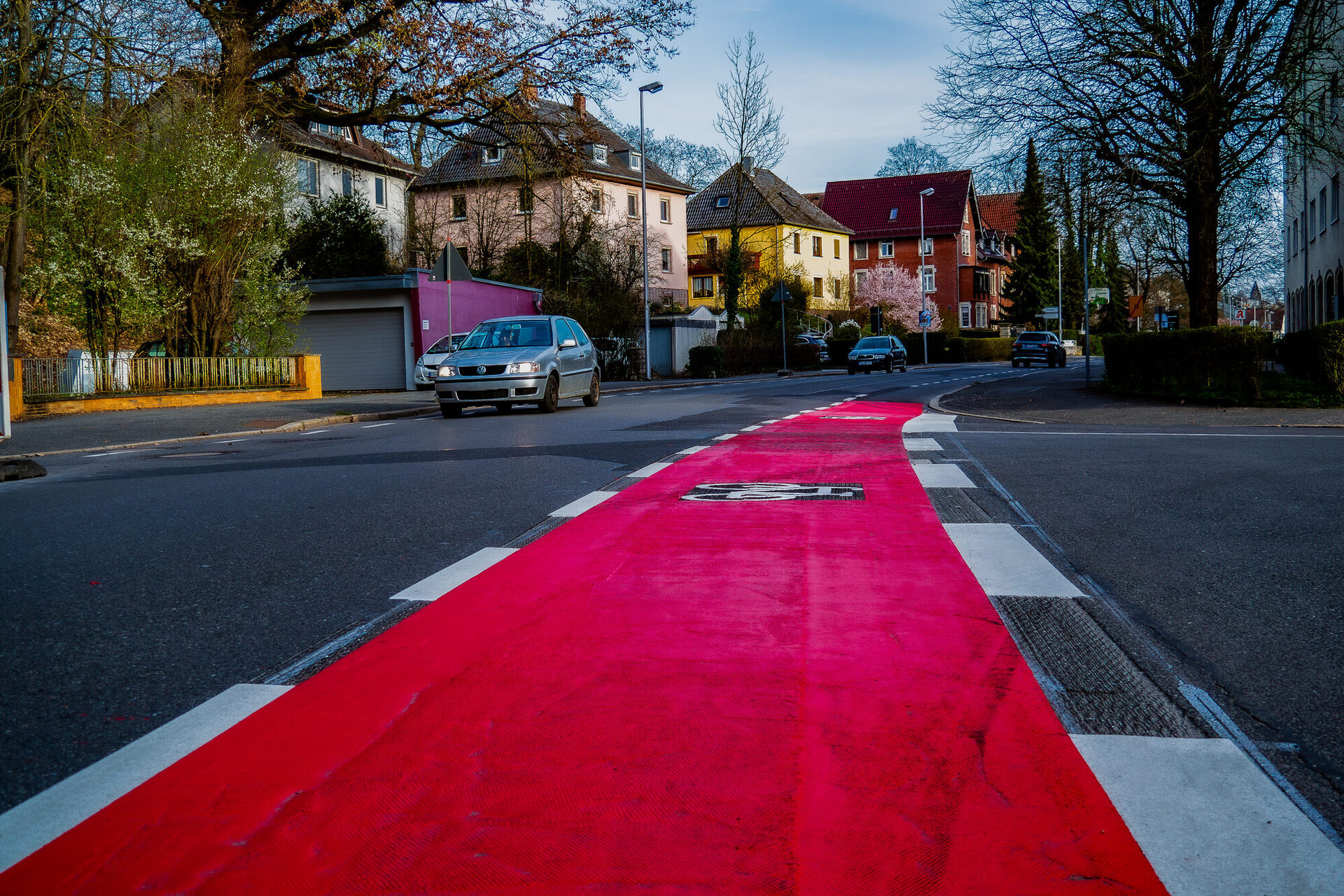 Rot ist eine Signalfarbe. Ist etwas rot, sehen alle gleich: Hier ist besondere Vorsicht geboten. Deswegen sieht das Radwegekonzept, das der Stadtrat im vergangenen Jahr beschlossen hat, auch vor, Radwege teilweise rot zu färben. Durch die Rotmarkierung soll erreicht werden, dass Autofahrerinnen und Autofahrer, die Wege gleich als Radweg erkennen und entsprechend vorsichtig fahren. Vor allem ist es wichtig, beim Überholen ausreichend Abstand zu halten, mindestens 1,5 Meter.
