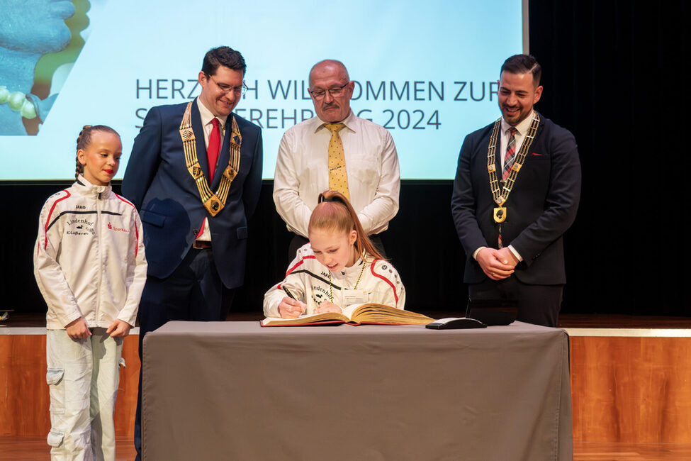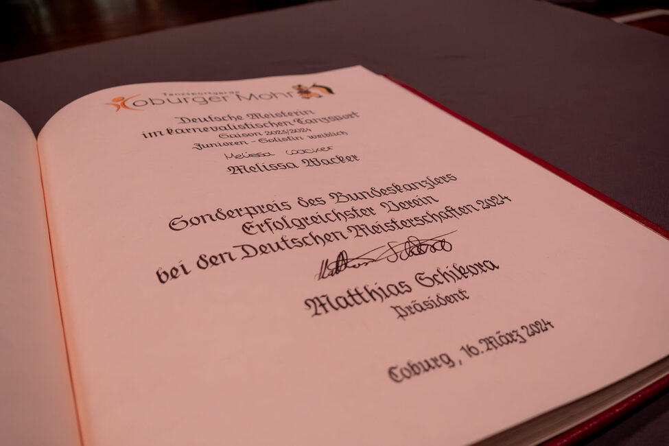 Das war aber nicht die einzige hohe Ehrung für die Tanzsportgarde Coburger Mohr an diesem Abend: Der Sonderpreis von Bundeskanzler Olaf Scholz war auch Anlass, dass sich die Tanzsportgarde einmal mehr im Goldenen Buch der Stadt verewigen durfte. Stellvertretend für alle Tänzerinnen und Tänzer übernahmen das Präsident Matthias Schikora und Melissa Wacker. Sie hat heuer zum ersten Mal als Solistin die Deutsche Meisterschaft ihrer Altersklasse gewonnen.