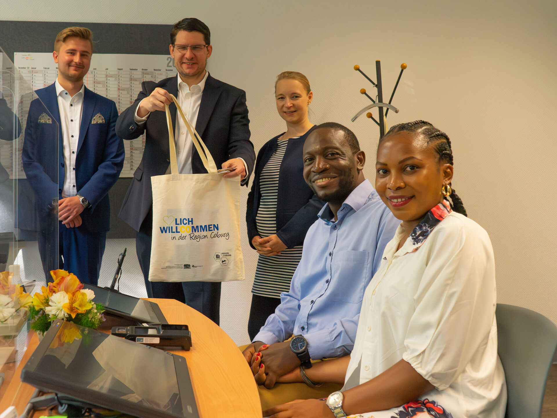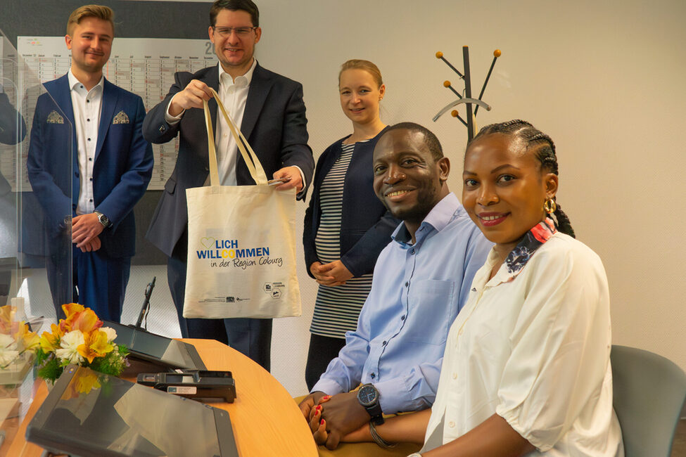 Auch Achombili Asango und seine Frau, Findo Floreen Linwe, sind kürzlich nach Coburg in die Nähe des Goldbergsees gezogen. Der 37-Jährige hat bereits an der Hochschule Coburg studiert und gute Erinnerungen an seine Zeit in der Vestestadt. Nach seinem Studium war er erst bei Airbus und zuletzt in Aschaffenburg tätig. „Nun bin ich mit meiner Frau zurück nach Coburg gekommen, um bei Valeo in Bad Rodach zu arbeiten“, erzählt Asango, der sich bei seiner Rückkehr besonders auf den ersten Biss in eine leckere Coburger Bratwurst gefreut hat. Die Willkommenstasche für das Paar überreichte Oberbürgermeister Dominik Sauerteig persönlich - eine Geste, die nicht jedem Neuankömmling zuteilwird: „Aufgrund der vielen Wechselbewegungen in der Bürgerschaft ist es für uns wichtig, dass die Neubürger*innen gut in der Gesellschaft ankommen. Herzlich willkommen zu sagen, ist dabei eine wichtige Geste für uns. Das Beispiel von Herrn Asango, der in Coburg lebt und in Bad Rodach arbeitet, zeigt uns außerdem, dass die Region gut zusammen funktioniert, nicht zuletzt dank des Regionalmanagements“, weiß das Stadtoberhaupt.