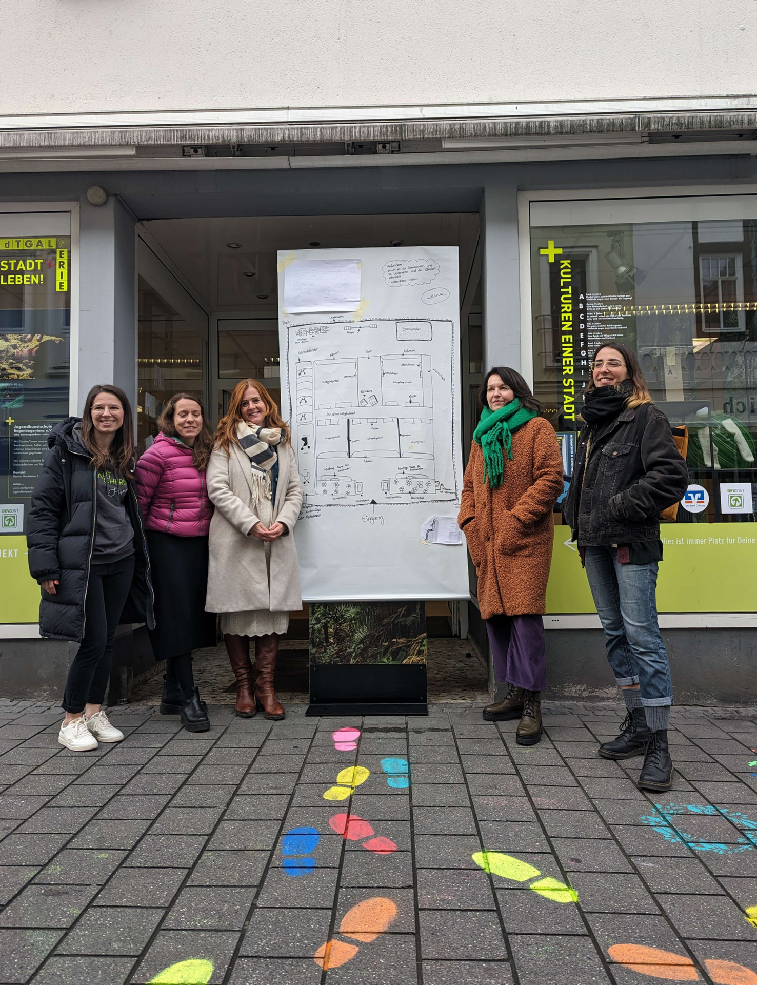 Laufen Sie in diesen nebligen Novembertagen doch mal durch den Coburger Steinweg. So kommt etwas Farbe in Ihren Alltag. Bunte Fußabdrücke, Schmetterlinge und Wolken locken Sie zur Hausnummer 37.