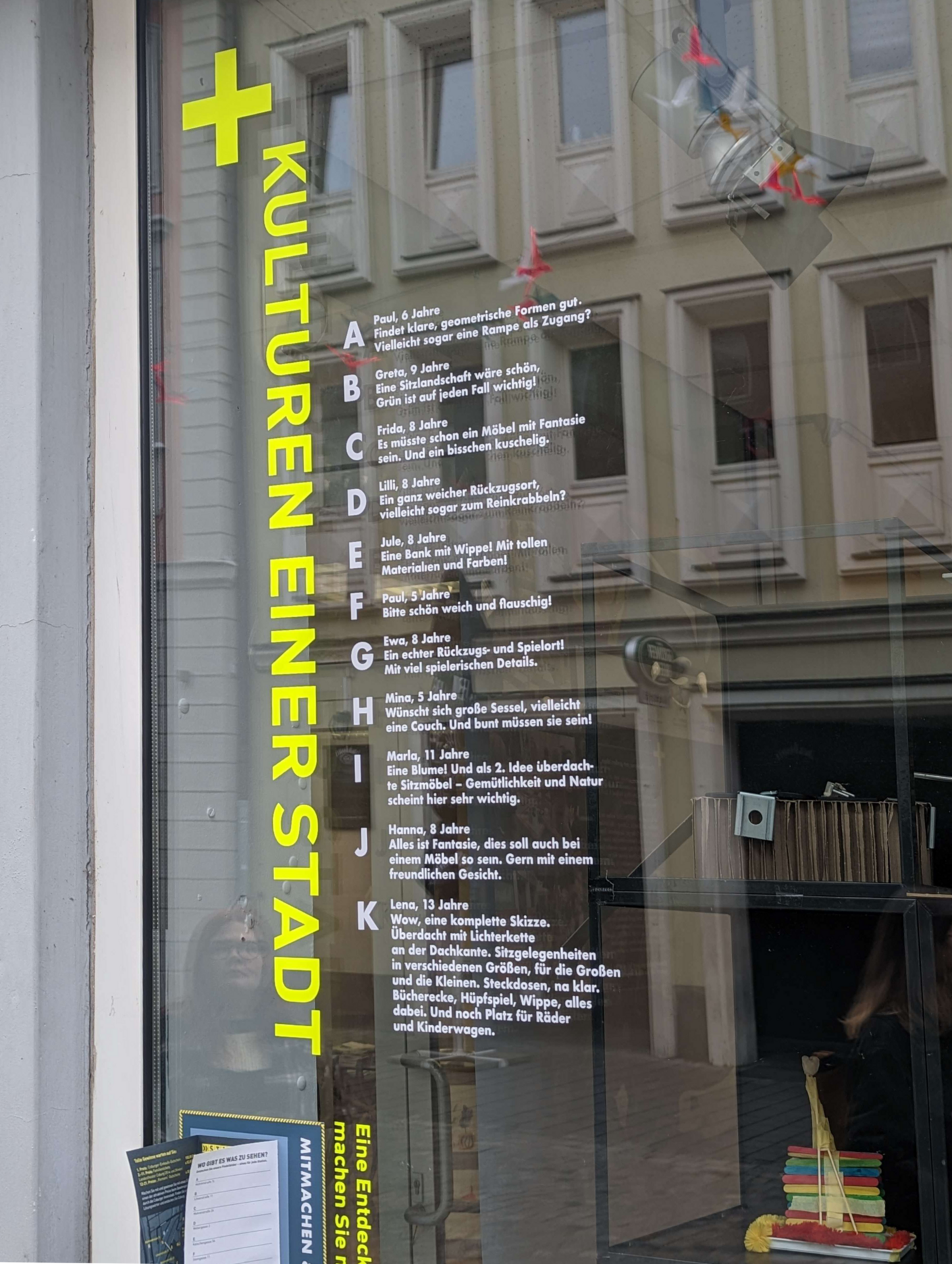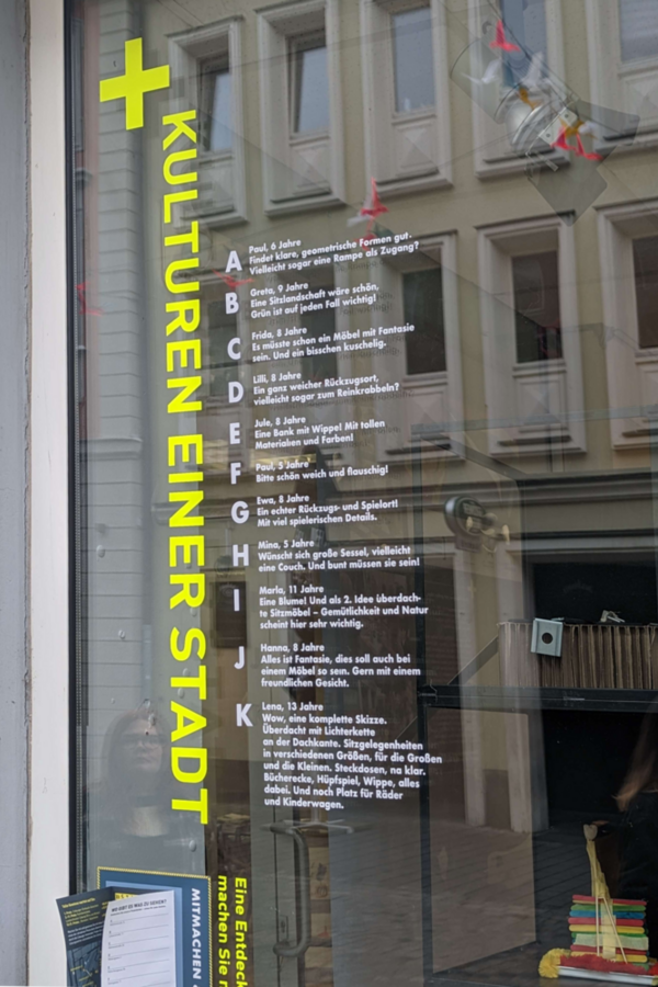 Schauen Sie dann auch einmal genau in das Schaufenster. Dort sehen Sie Modelle von ganz besonderen Sitzmöbeln. Ein paar schauen auch zurück. Gesichter mit großen Augen waren einigen Kindern nämlich ganz wichtig, als sie gefragt wurden, welche Bänke, Tische und Stühle sie gerne in der Innenstadt hätten.