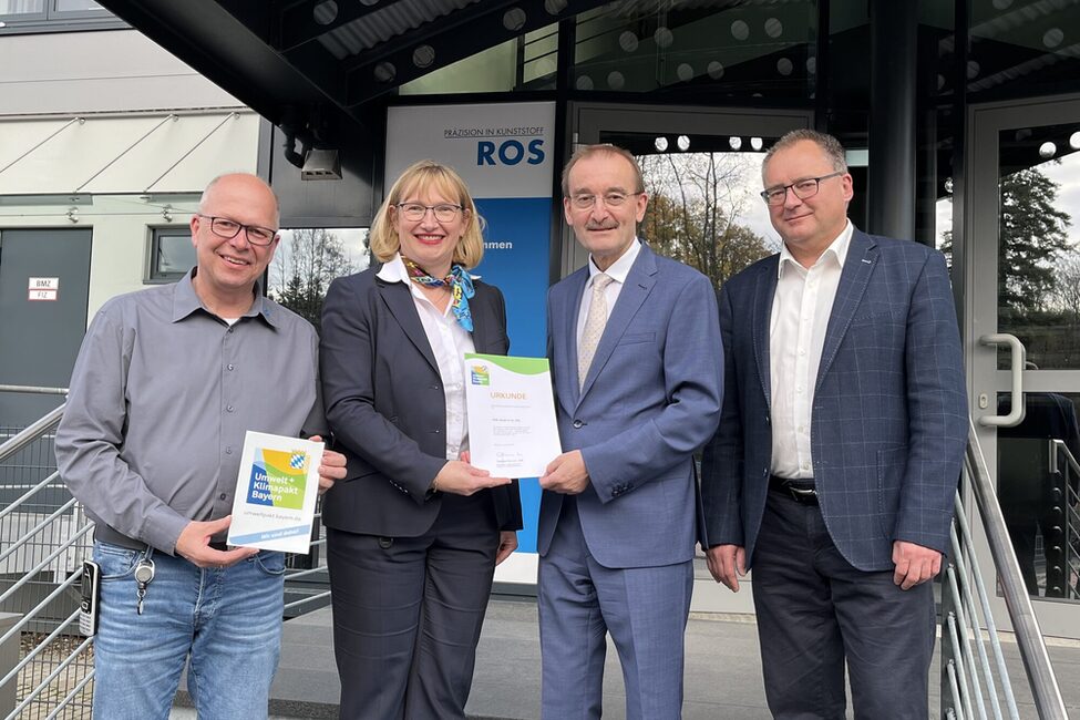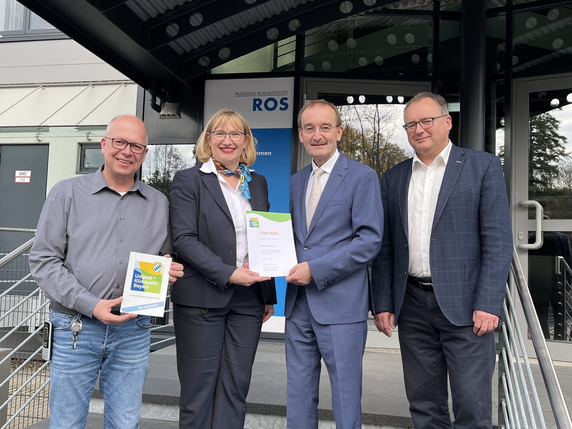 Der Bayerische Staatsminister für Umwelt und Verbraucherschutz, Thorsten Glauber, hat die Firma ROS für die Teilnahme am Umwelt- und Klimapakt Bayern ausgezeichnet. Die Urkunde übergab Coburgs 2. Bürgermeister Hans-Herbert-Hartan am ROS-Standort in Coburg. „Die Stadt Coburg gratuliert ganz herzlich für den aktiven Beitrag zum Umweltschutz“, erklärte Hartan „An diesem Pakt ist der Multiplikatoreneffekt besonders wichtig. So können auch andere Unternehmen von den Ideen profitieren.“