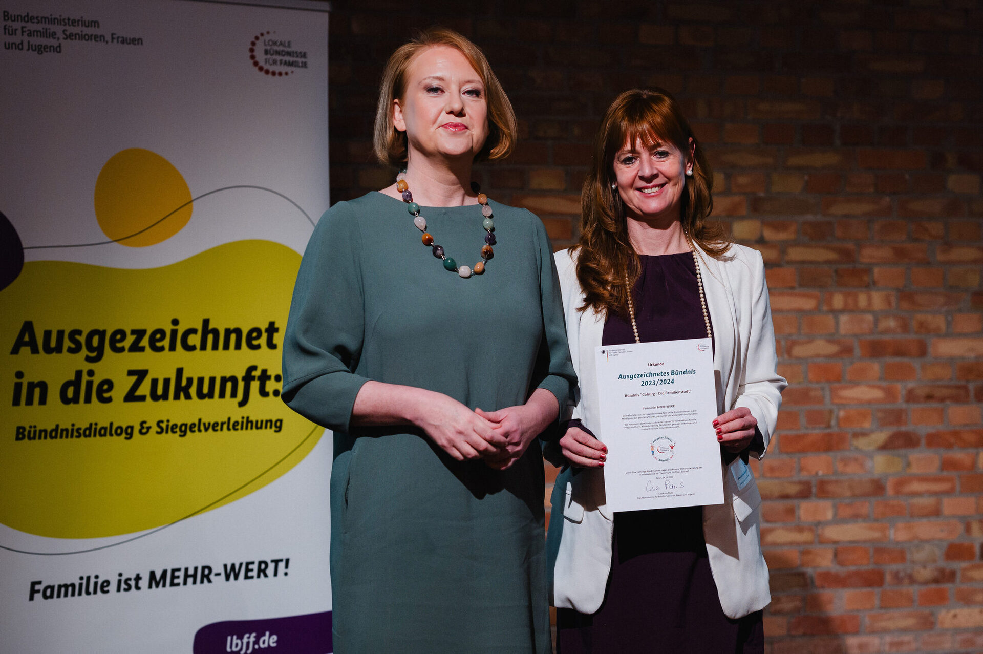 Am 24. November 2023 fand der Bündnisdialog der Bundesinitiative „Lokale Bündnisse für Familie“ statt. Unter dem Motto „Ausgezeichnet in die Zukunft“ wurden 56 Lokale Bündnisse für Familie aus ganz Deutschland von Bundesministerin Lisa Paus für ihr familienpolitisches Engagement vor Ort ausgezeichnet. Darunter war auch das lokale Bündnis „Coburg – Die Familienstadt“. Bianca Haischberger, Leiterin der Stabsstelle „Bündnis Coburg – Die Familienstadt & Demografie“ nahm in Berlin die Auszeichnung entgegen. „Wir freuen uns über die Wertschätzung aus dem Bundesfamilienministerium, die unserer Bündnisarbeit entgegengebracht wird“, so Haischberger.