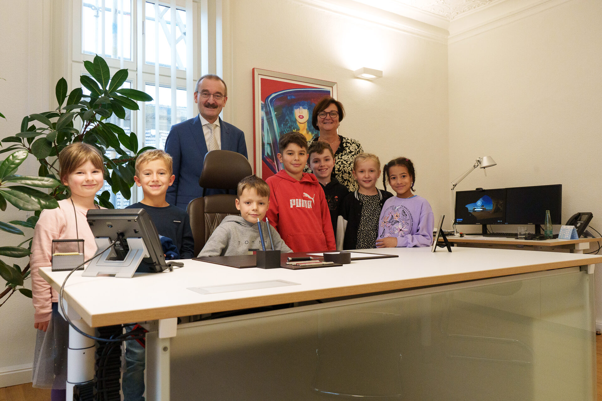 In der Grundschule Neuses gibt es in allen Klassen das Amt der Klassensprecherinnen und Klassensprecher. Sie vertreten die Klasse in Versammlungen und den Monatsfeiern. Jetzt waren alle Gewählten unterwegs und besuchten mit ihrer Rektorin Jasmin Müller-Ahlefeld den 2. Bürgermeister Herrn Hans-Herbert Hartan in seinem Büro. Es galt herauszufinden: Was haben die beiden Ämter gemeinsam – wo sind die Unterschiede? Alle Fragen wurden beantwortet und nach einem Mittagessen konnten im Besprechungsraum des Bürgermeisters die Aufgaben der Klassensprecherinnen und Klassensprecher und die Anliegen der Schule diskutiert werden. "Mitdenken-Mitdenken-Mitgestalten" heißt der Schulversuch zur Demokratieerziehung in der Grundschule, an dem die GS Neuses schon im 3. Jahr beteiligt ist.