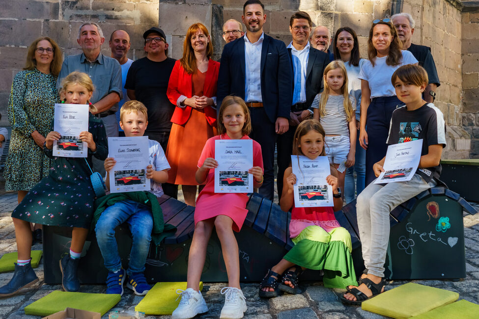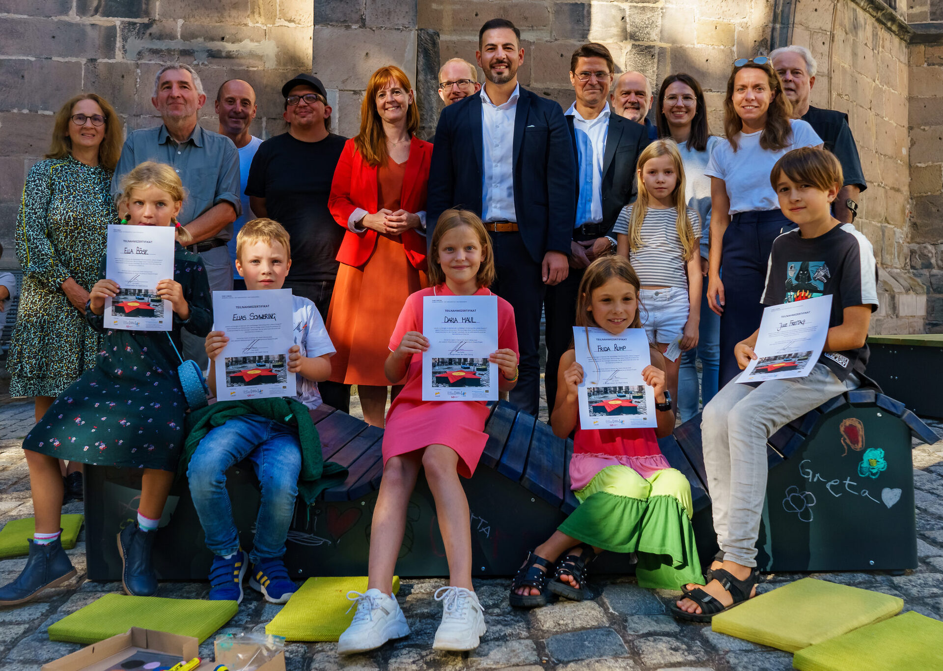 Pünktlich zum Weltkindertag am 20. September 2023 wurde das fertige Kindersitzmöbel jetzt in der Coburger Innenstadt neben dem Brunnen an der Morizkirche (Pfarrgasse 5, 96450 Coburg) aufgestellt. Eingeweiht wurde das neue Stadtmöbel am Mittwochnachmittag, 20.09. durch den 3. Bürgermeister und Sozialreferenten Can Aydin sowie die Projektbeteiligten. Die Kinder, die als „Kleine Designer“ am Coburger Sitzmöbel mitgearbeitet haben, durften das neue Möbelstück mit ihrem Namen signieren und erhielten Zertifikate.