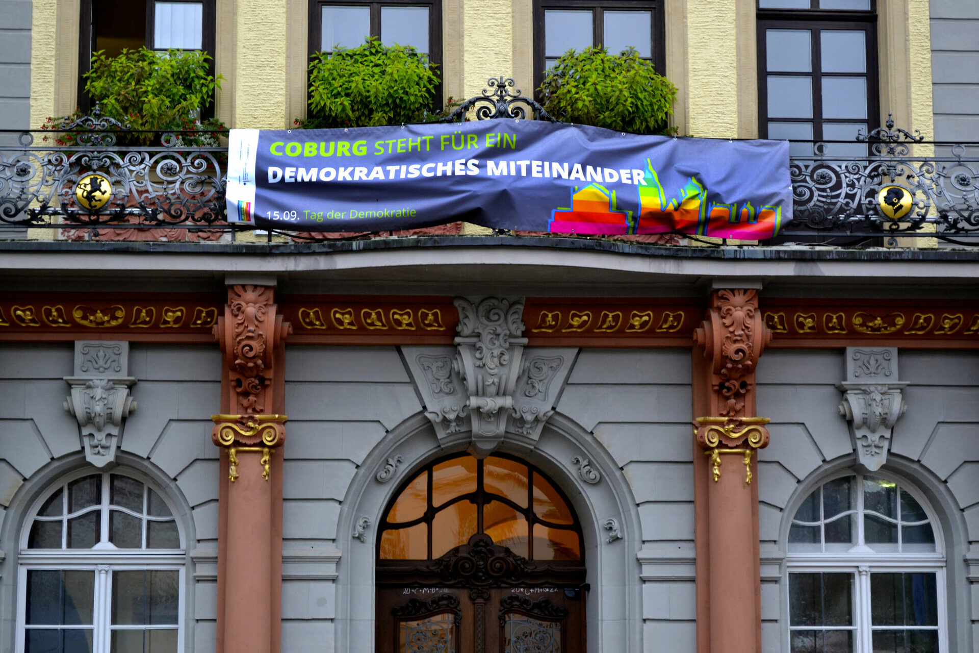 Die Stadt Coburg setzt für diese Werte am Internationalen Tag der Demokratie ein Zeichen. Am Rathausbalkon hängt für den Gedenktag ein Banner. Dieses zeigt die Werte der Stadt auf und demonstriert, dass Coburg für ein demokratisches, pluralistisches Miteinander steht. Es soll deutlich gemacht werden, dass Demokratie auch hier nicht selbstverständlich ist. Die Stadt Coburg hat im letzten Jahrhundert zwei Diktaturen erlebt. Während sie im Nationalsozialismus als „erste braune Stadt“ eine traurige Berühmtheit erreichte, wurde Coburg durch die DDR seiner Lage in der Mitte Deutschlands beraubt und stand in drei Himmelsrichtungen dem Eisernen Vorhang gegenüber. Die Überreste dieser menschenverachtenden Grenzanlagen lassen sich noch heute all zu leicht finden.