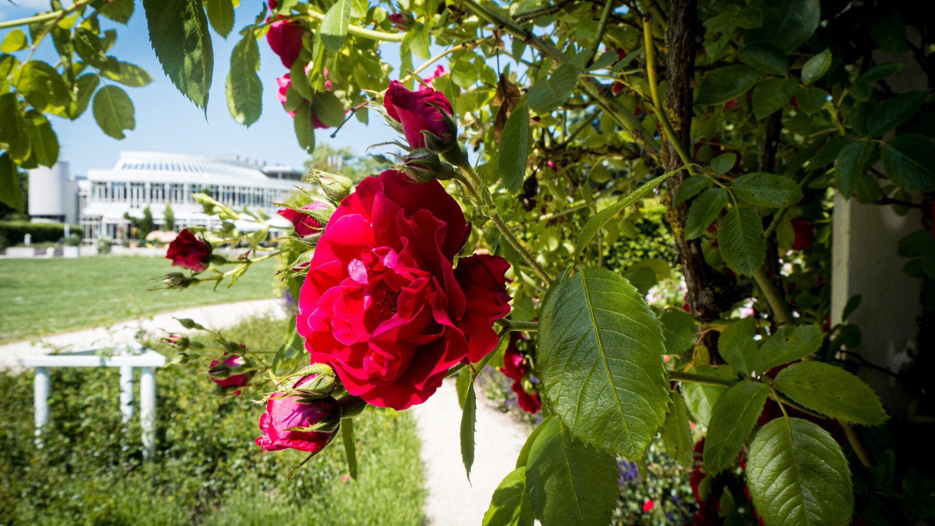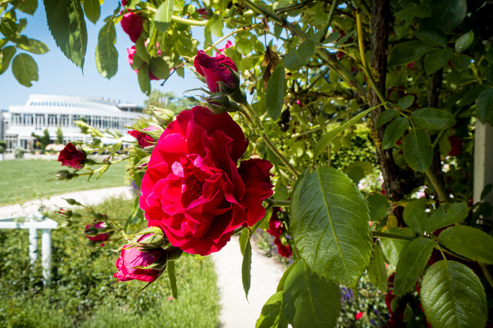 Im Rosengarten sind über 70 Rosensorten gepflanzt, die gepflegt werden wollen. Zwei erfahrene Gärtner zeigen Interessierten den richtigen Schnitt. Dabei erfährt man auch nützliche Hinweise zu Düngung und Pflanzenschutz.