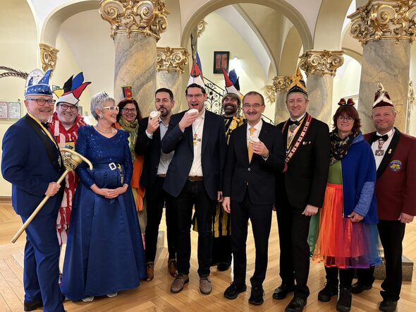 Bewaffnet mit Krapfen luden IG Helau, die Coburger Narrhalla und der Karnevalsverein Weidach zur Pressekonferenz im Rathaus. Närrisch geehrt wurden Oberbürgermeister Dominik Sauerteig gemeinsam mit den zwei Bürgermeistern Hans-Herbert Hartan und Can Aydin für ihr Mitwirken am Faschingstreiben in der Vestestadt.